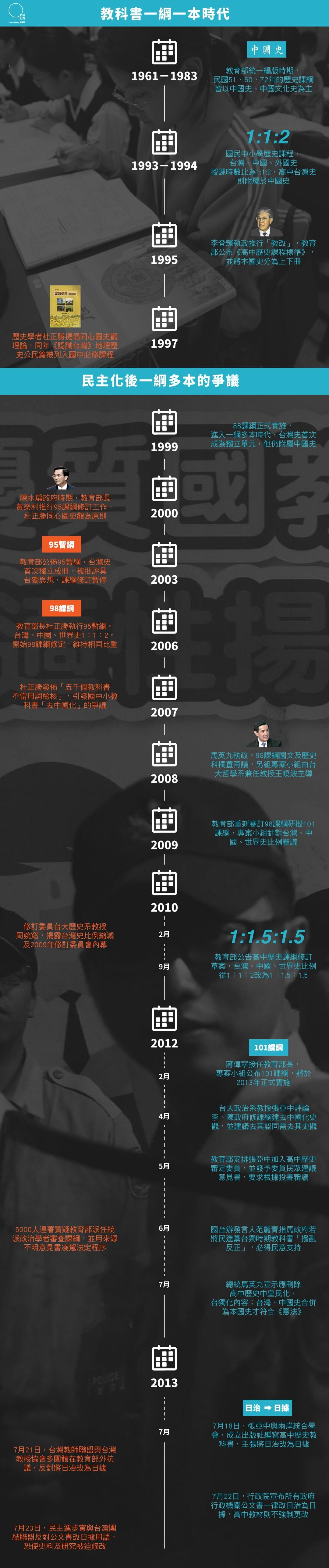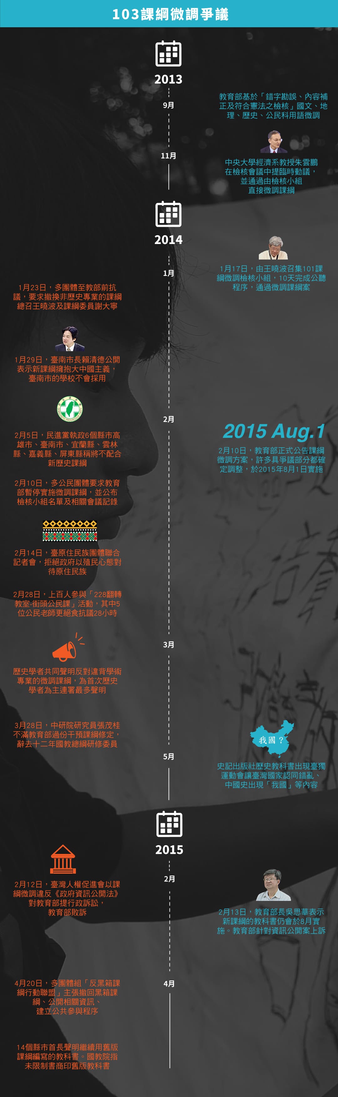 台湾中学自1960年代开始实行“一纲一本”,尽管自1990年后的“一纲多本”政策,松绑了向来由国家编订教科书版本的做法,允许民间出版社自行编写课本供学校选用,但每逢教育部订定或修改历史、语文、公民等人文学科的“课程纲要”,毫无例外地必然成为意识型态斗争的角力场。2015年的初夏,课纲运动的主体由政党人士、公民团体,交棒到中学生手中。自台中一中苹果树公社在5月首开第一枪,学生们用他们的怒火改写并创造新的历史。