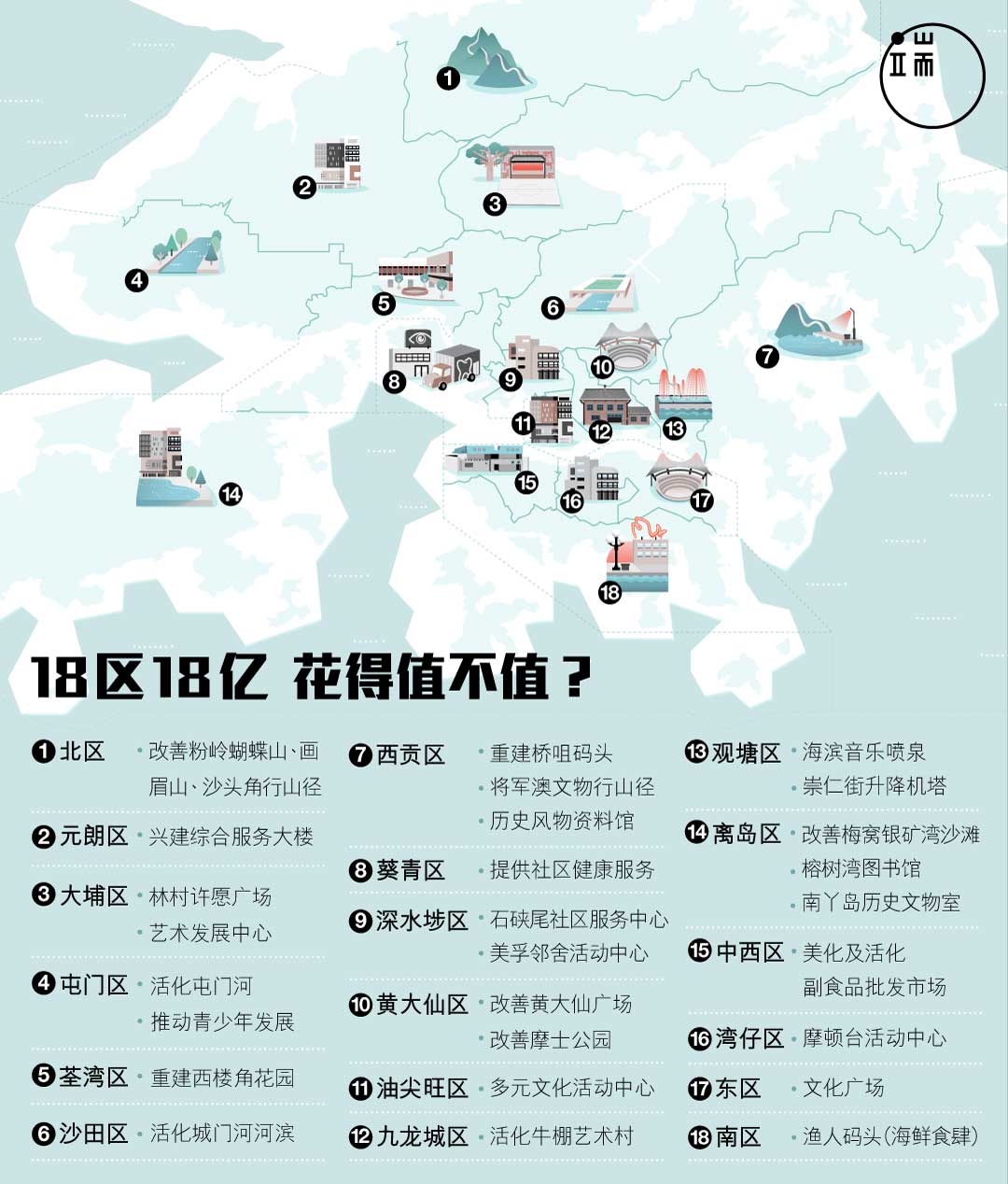 港府为18个区议会各自预留1亿元推展社区项目,有地区出现了“天安门”,有地区建成了健康中心。