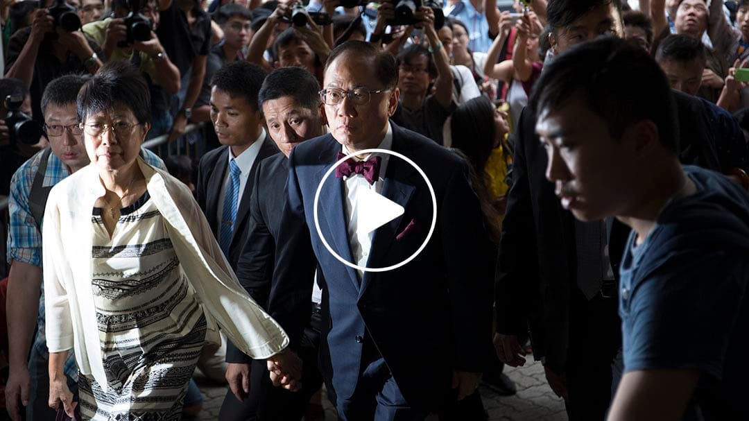 经过三年调查,前特首曾荫权终被廉署正式起诉两项公职人员行为失当罪名。两天后将71岁生日的曾荫权,据悉今早到北角廉署总部;并于下午二时于妻子陪同下,打着其招牌「煲呔」,抵达东区裁判法院。