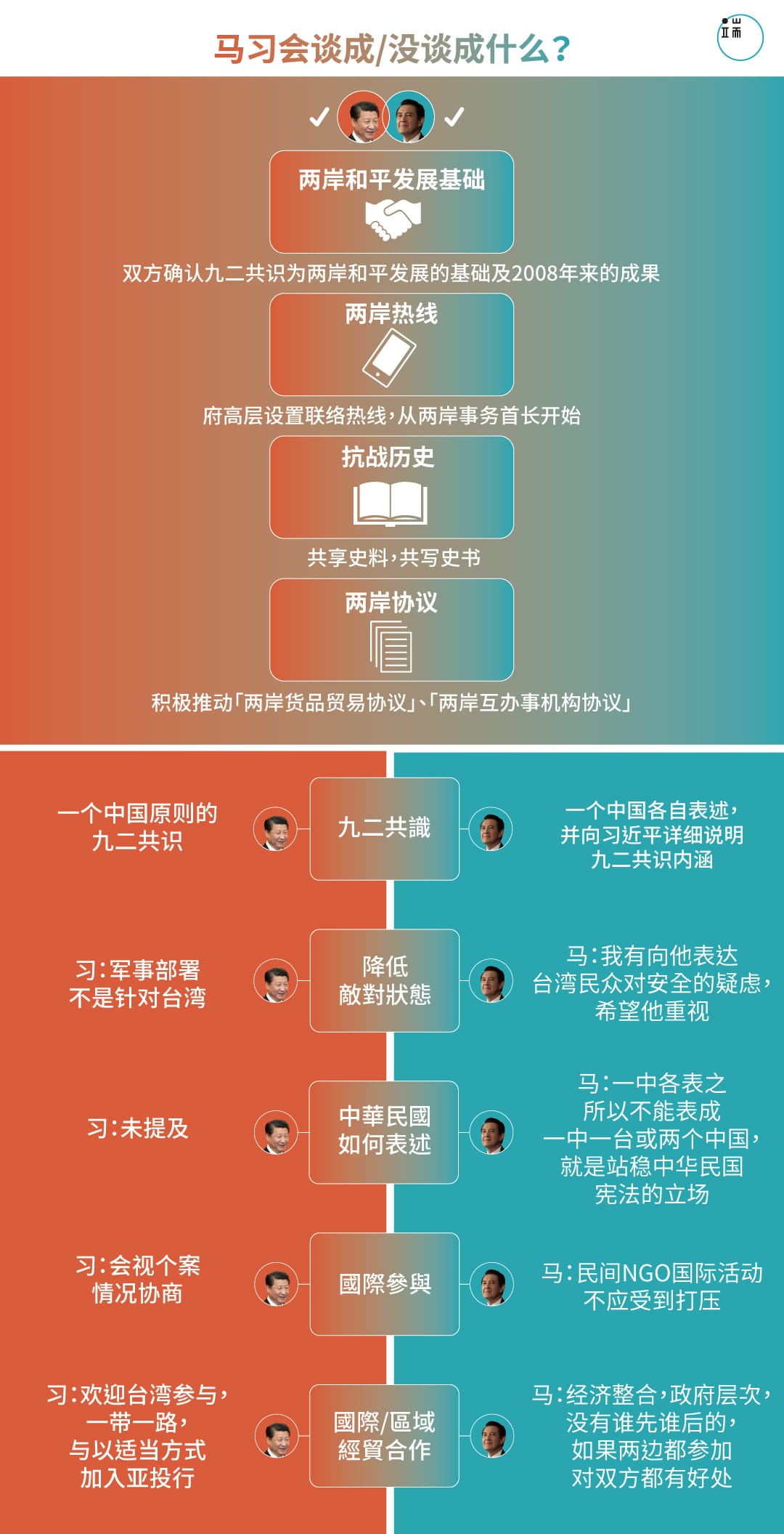 众所瞩目的两岸领导人“马习会”7日登场,各界对这场等了66年的会面内容充满期待,但两人究竟谈了什么,是否符合各方期许?端传媒用一张图表告诉您……