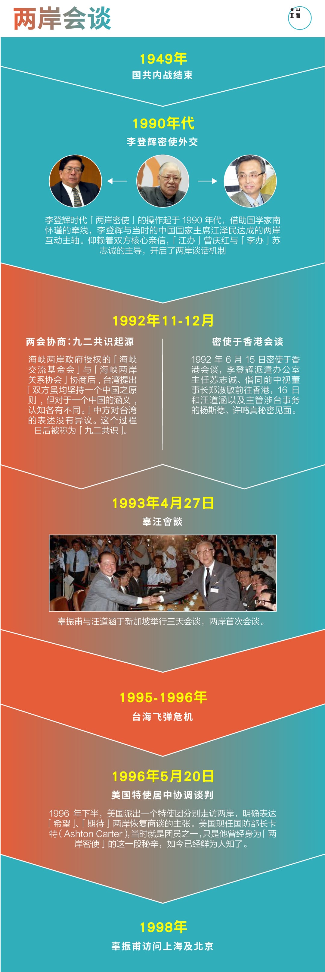 1949年国共内战结束,两岸分裂分治从此展开,一直到今天。在过去的66年间,两岸的政治往来有哪些重要的事件、节点或者分水岭,让彼此的关系能够从你死我活的热战,走到今天的两岸元首平起平坐。端传媒用一张图表告诉您……