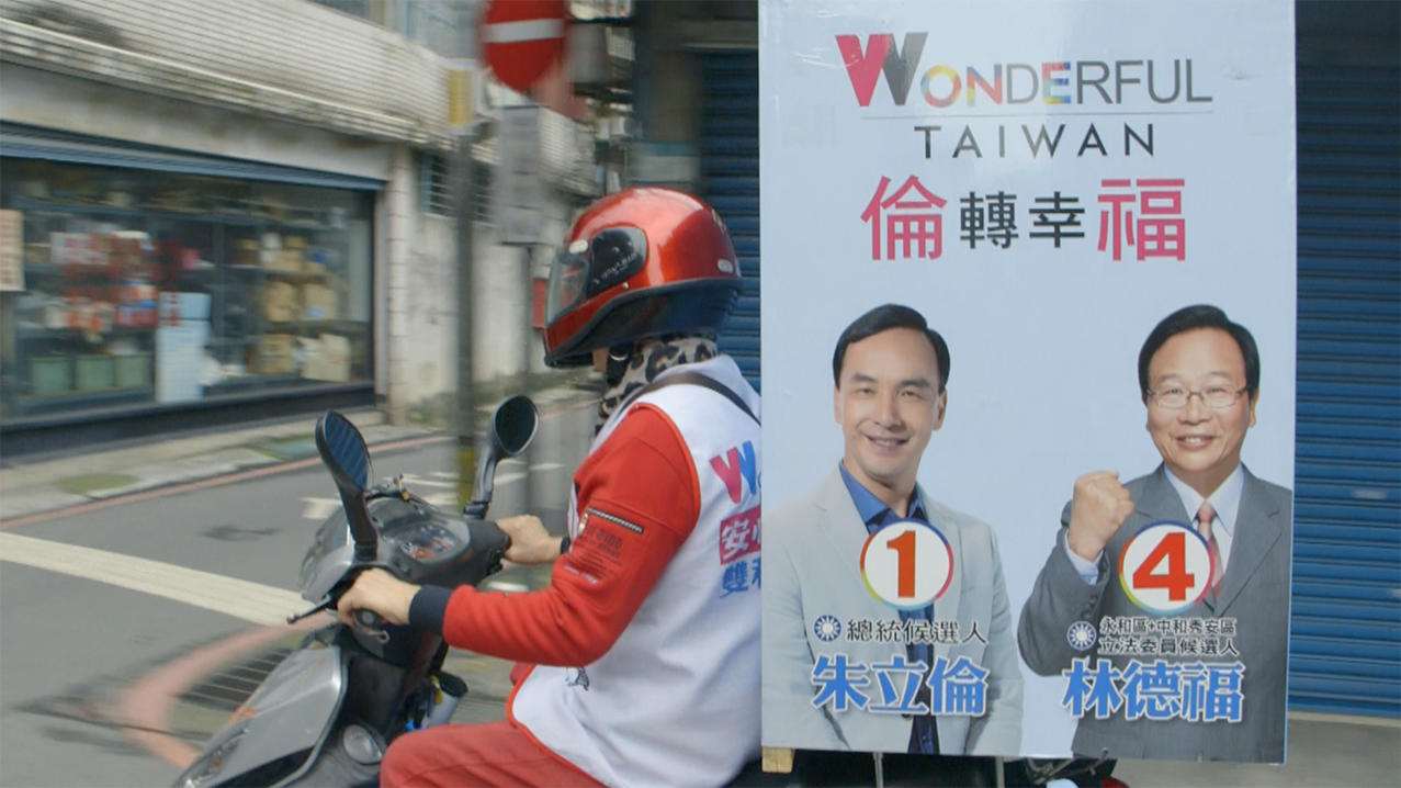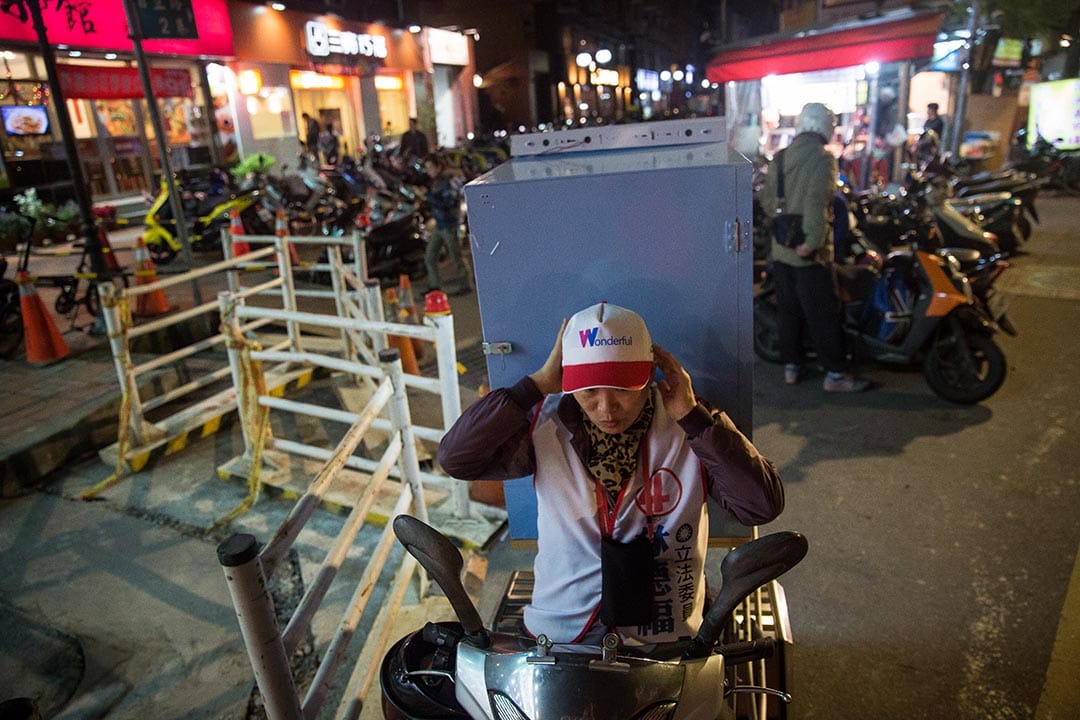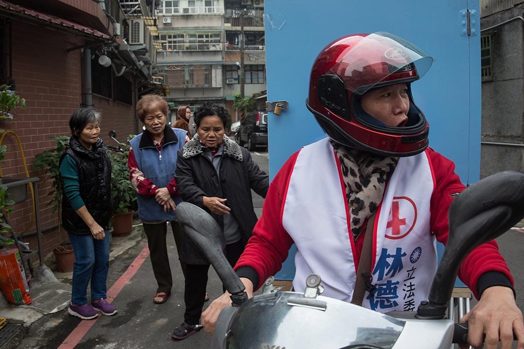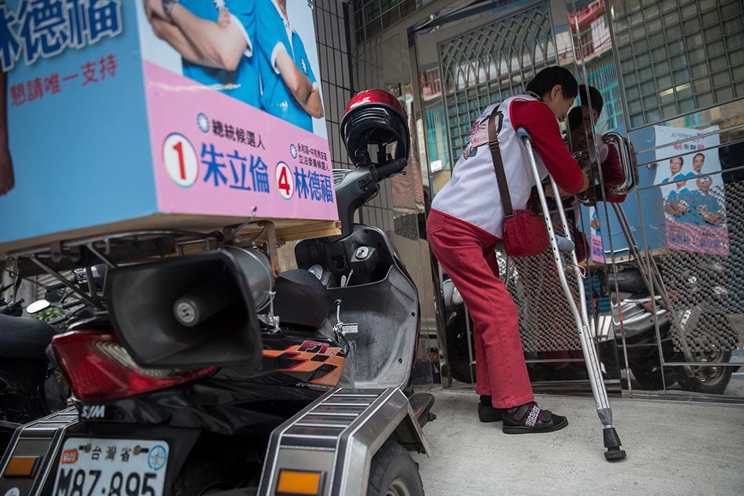 她是國民黨新北市永和選區立法委員候選人林德福的助選員,工作是「騎宣傳車」:她的機車後頭載了一個喇叭,播放著林德福和朱立倫的拜票錄音,穿過大街小巷,把一段平板、簡單的拜票訊息從街上放送到選區住戶家裡。