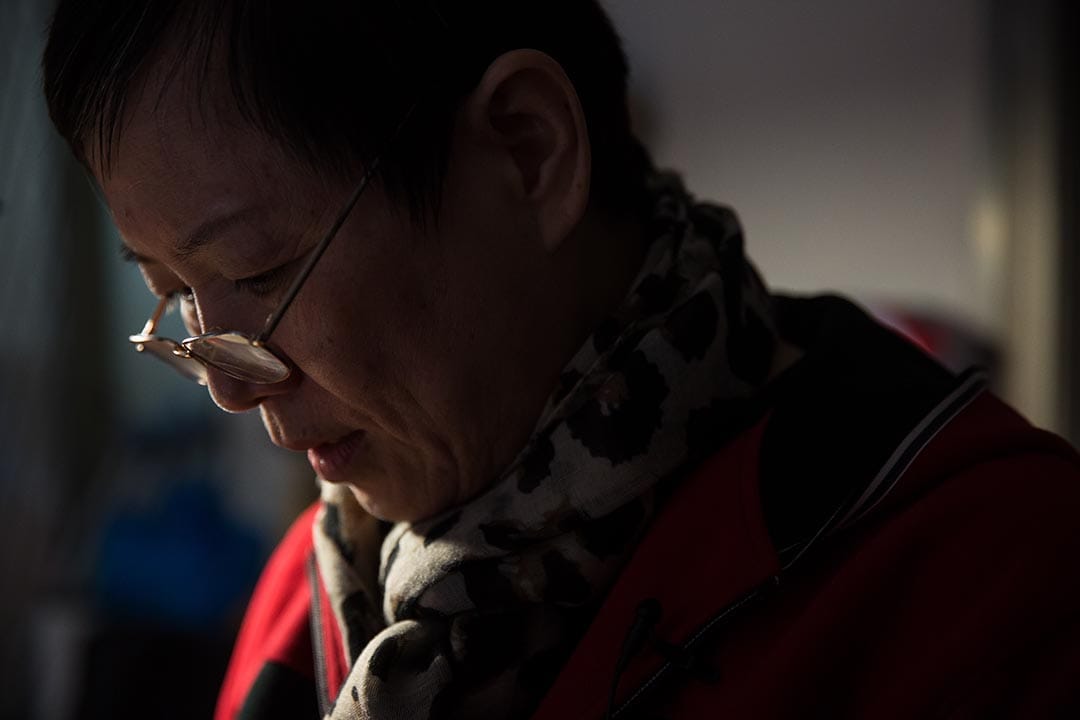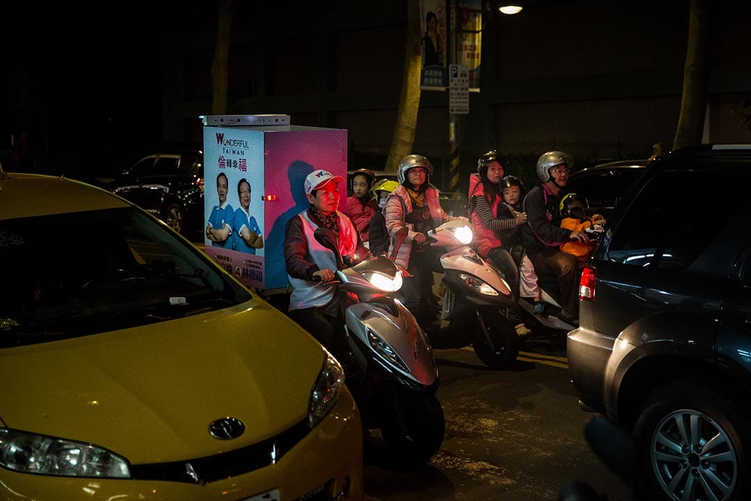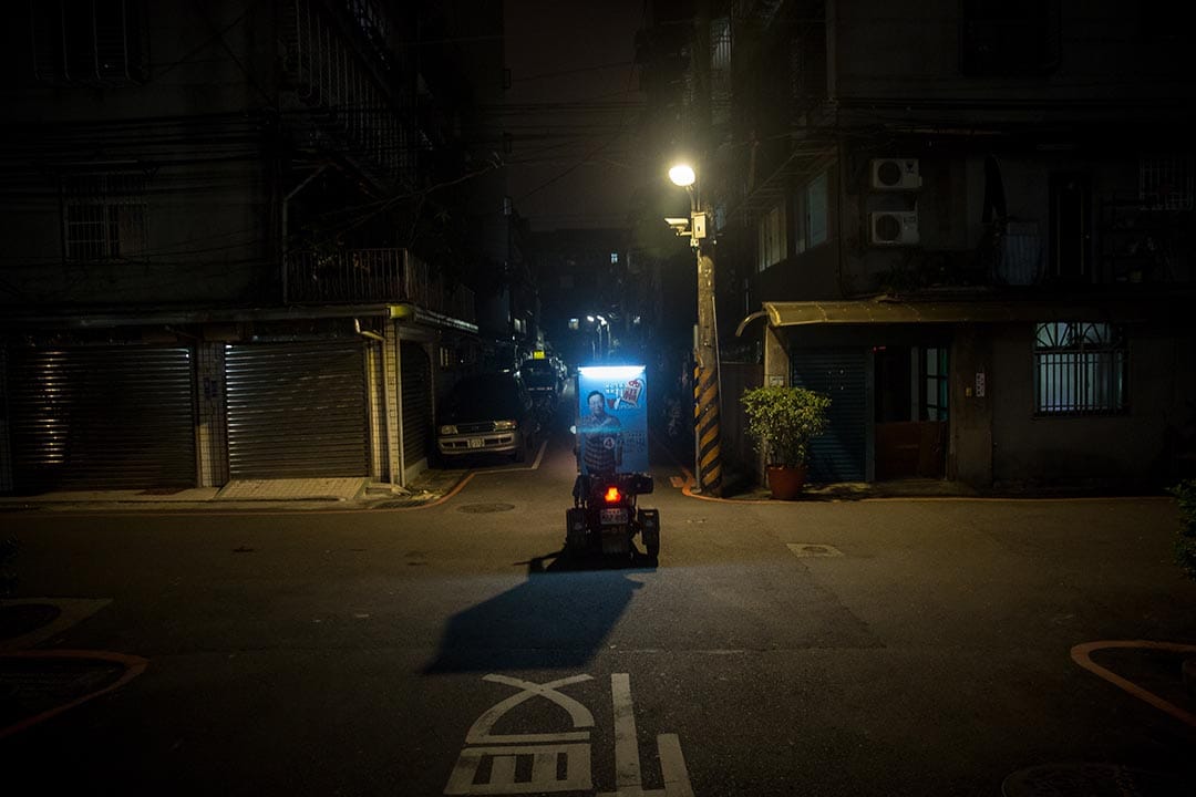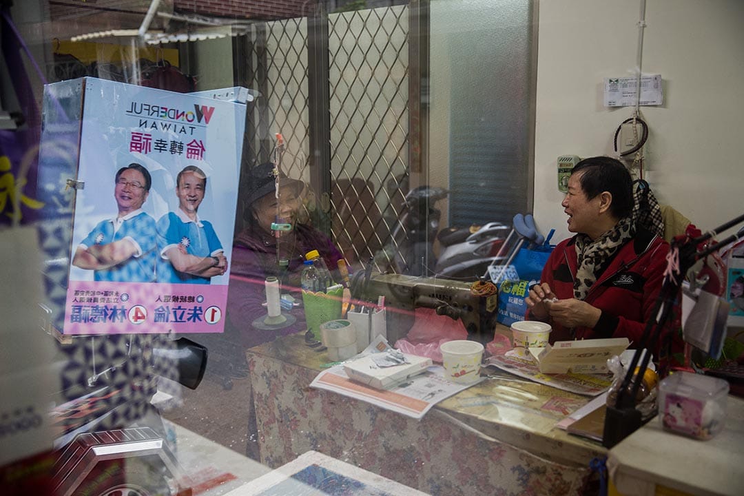 她是國民黨新北市永和選區立法委員候選人林德福的助選員,工作是「騎宣傳車」:她的機車後頭載了一個喇叭,播放著林德福和朱立倫的拜票錄音,穿過大街小巷,把一段平板、簡單的拜票訊息從街上放送到選區住戶家裡。