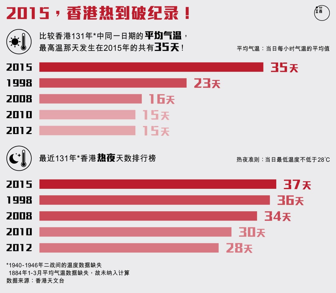 纵观131年,比较同一日期的平均气温,最高的那天发生在2015年的,达到35天,远远抛离排在其后的1998年23天,以及2008年16天。而热夜(日最低温度不低于28°C)天数达到37天,刷新记录。