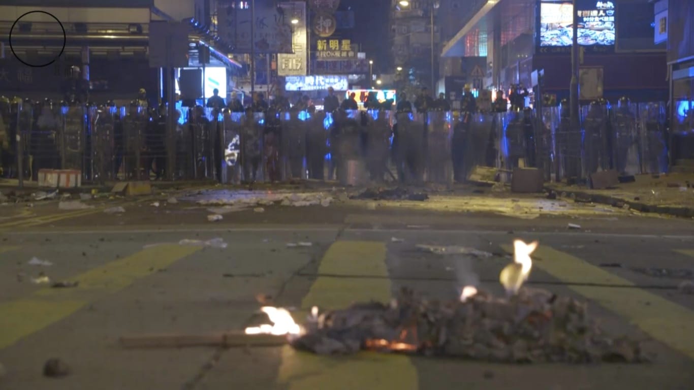 凌晨约5时,有示威者用竹枝做成火把投向警察。