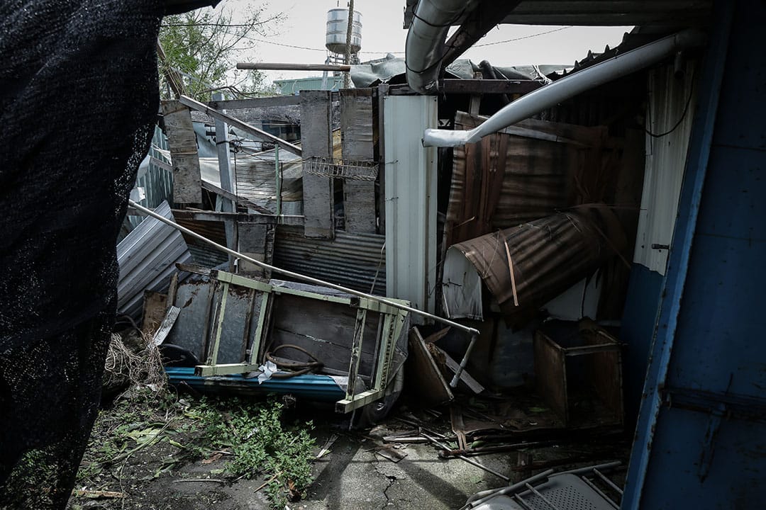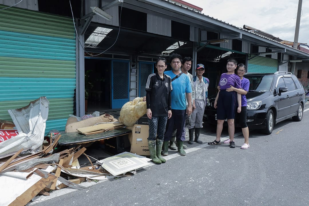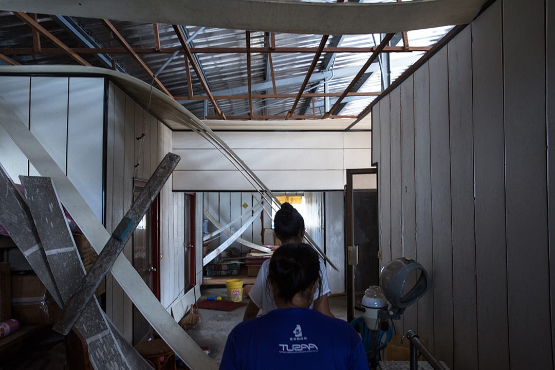 颱風過後,家裡水管破裂沒水也沒電,洗澡就去隔壁妹妹家洗,到了晚上,用摩托車的電瓶接上LED燈,一家人就這樣捱著微弱的燈光度過黑夜。奶奶有一片田,請別人管理,颱風到現在因忙著整理家裡,都還沒到現場看災害狀況。雖然房屋修繕需要很多時間,但奶奶樂觀的說,人沒事就好。
