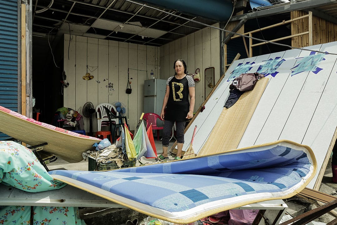 老家在台東東河鄉的美枝,為了餐廳的工作,租屋在知本。颱風那夜,為了怕租屋處鐵門損毀後會出不去,索性不關鐵門,但裏頭的傢俱被吹得東倒西歪,床鋪也全濕;鐵皮屋的租屋處兩房一廳,在風雨過後,客廳已經毀損,沒電可用的情況下,只能任由冰箱的東西腐敗;房東允諾修繕負責,她也趁著這兩天不能上班,開始打掃自己的私人物品。