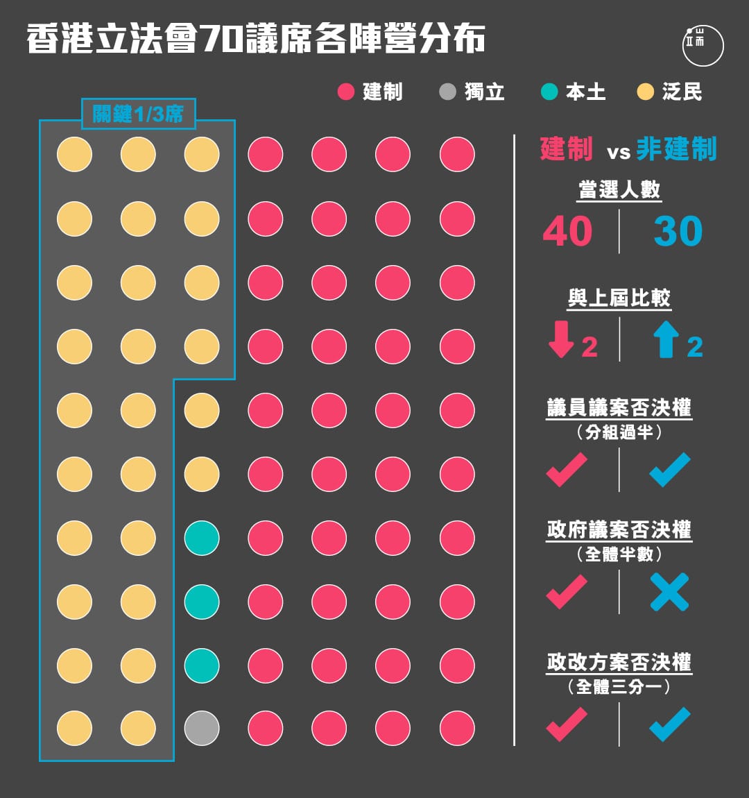 2016香港立法會選舉70個議席全部產生,本屆泛民取得26席,本土派取得3席,獨立取得1席,而建制派則取得40席。相比上屆,非建制陣營多了2席,建制陣營少了2席。這意味着兩個陣營都有議員議案及政改方案的否決權。不過,非建制陣營卻未能取得政府議案否決權。與上屆相比,建制陣營少了2席,本土陣營多了2席,而泛民的議席則維持不變。圖︰端傳媒設計部