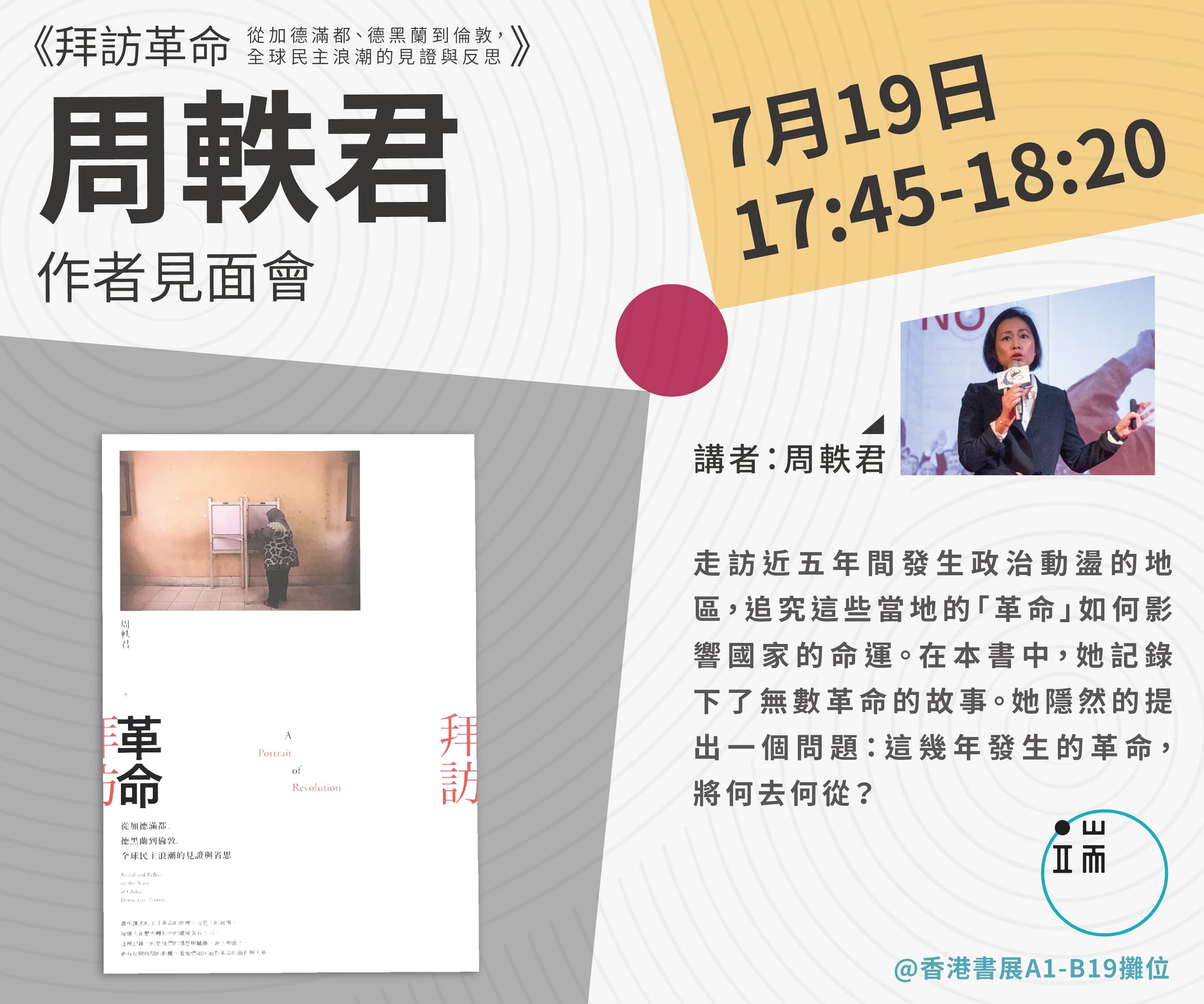 「香港書展2017」將於7月19至25日在香港會議展覽中心舉行。端傳媒亦設有攤位,以展示《端傳媒》的應用程式,售賣書籍及紀念品,及提供一個輕鬆的讀者交流場地。今年,端傳媒將推出七本書。此外,在書展期間,端亦將舉辦一系列的作者見面會及對談會,邀請作家名人與讀者交流心得,暢談大小議題。如果您是端的尊享會員,您將可以優先在此報名。見面會詳情如下。《拜訪革命》作者周軼君見面會