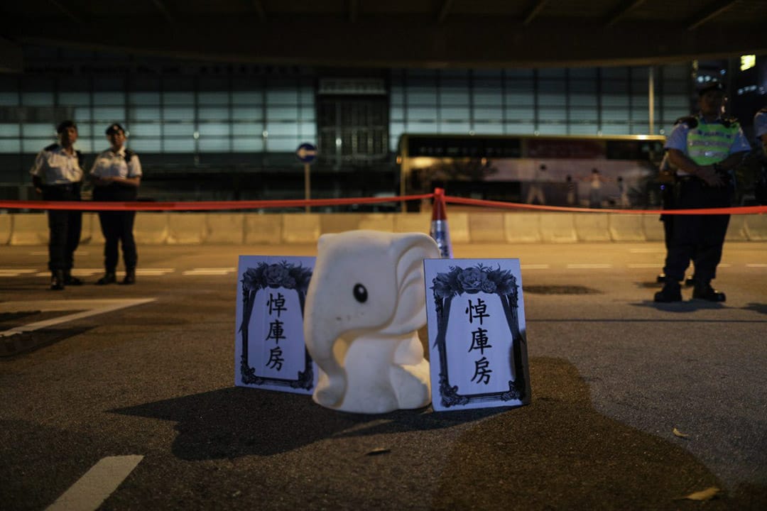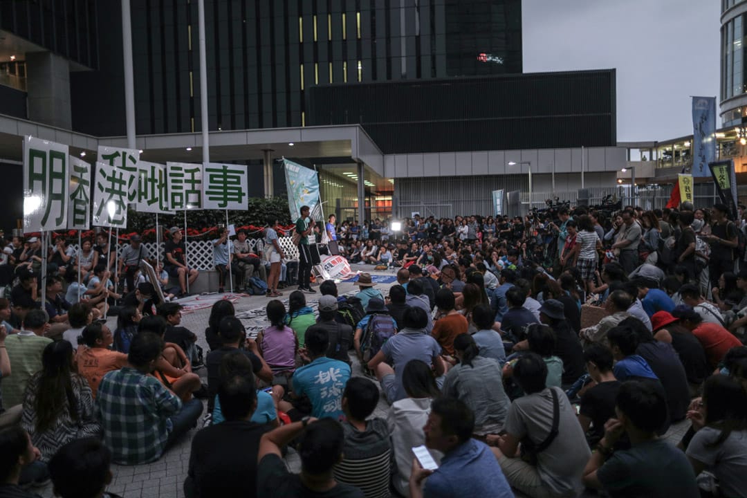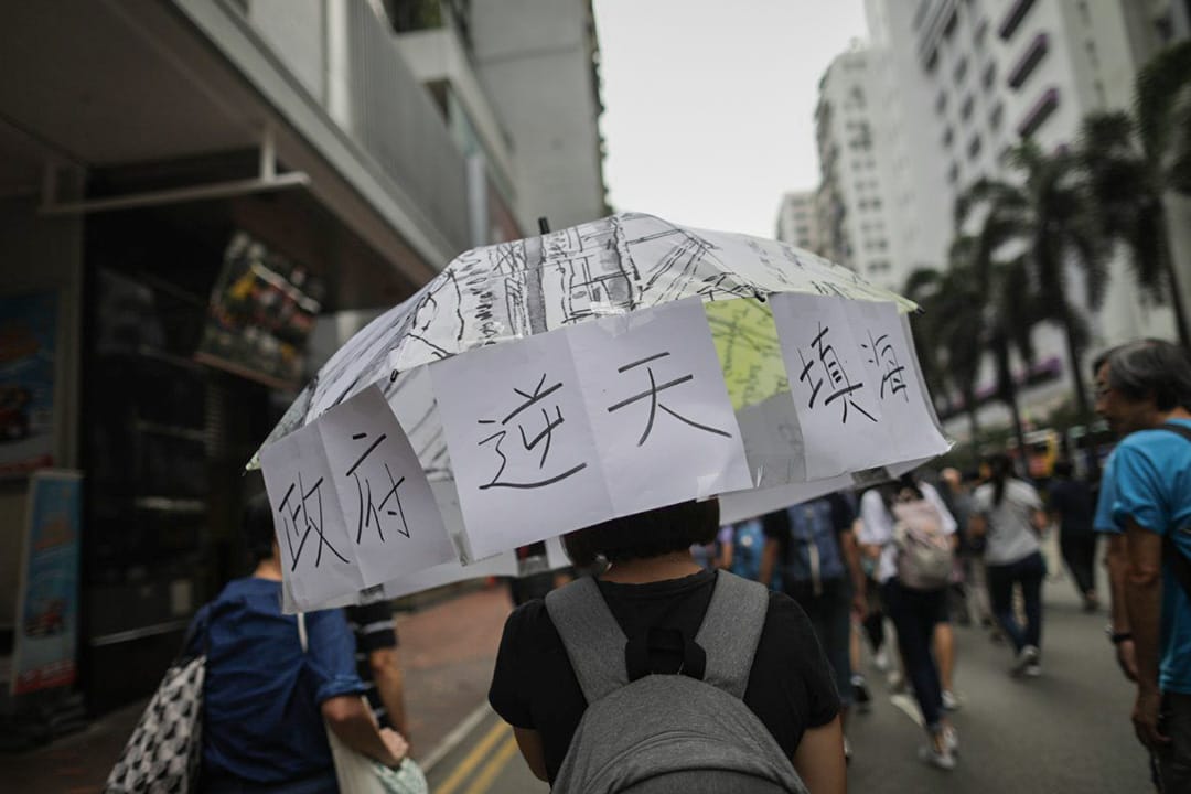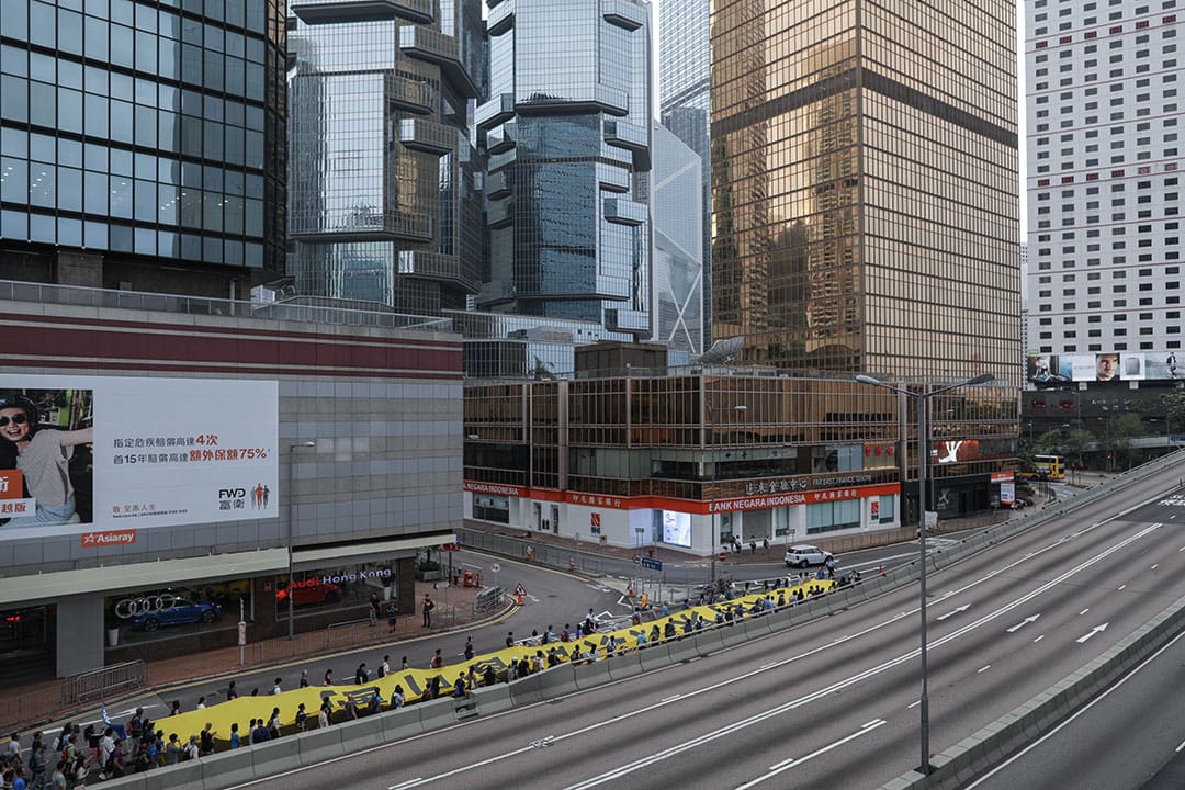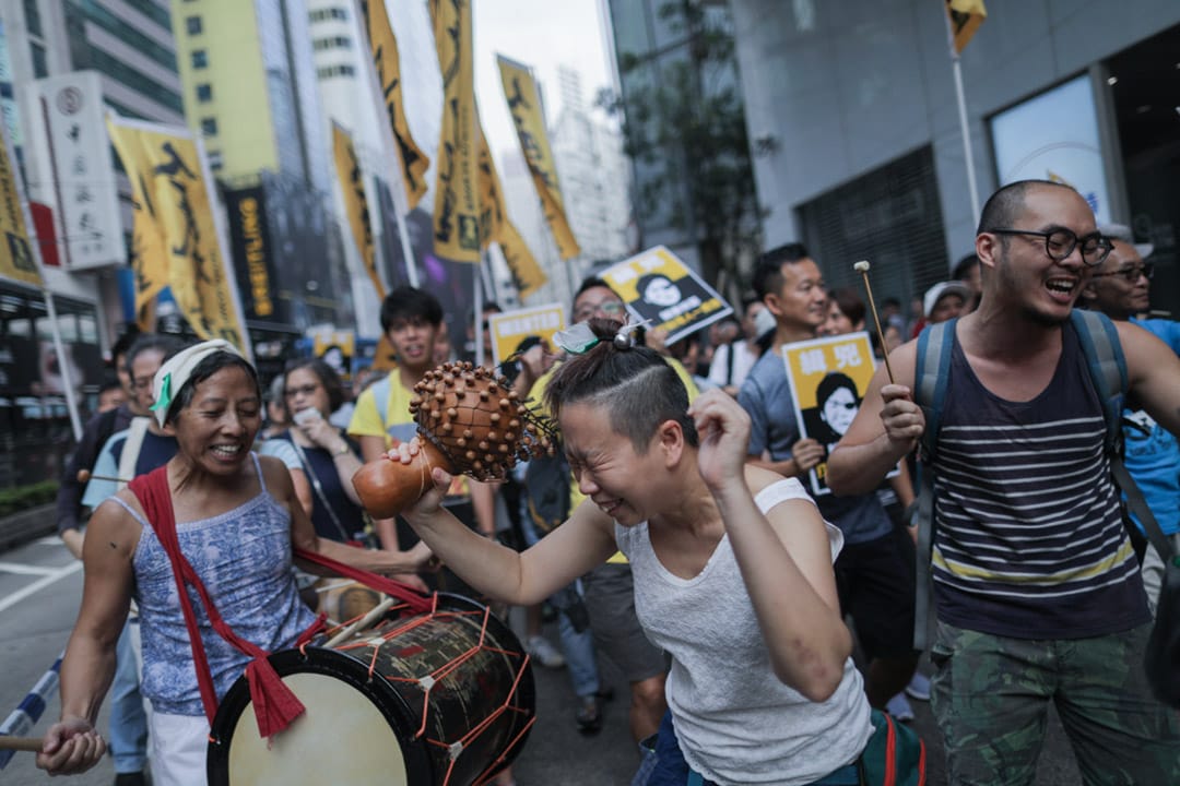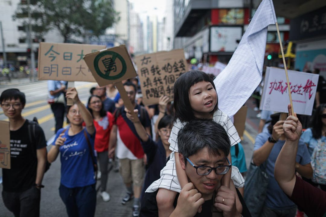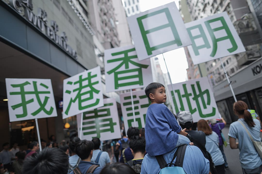 人声鼎沸,缤纷的泡泡随风飘向商业大楼。不到半腰高的孩子们,举著各式各样的纸牌,脸上画著东大屿山和海豚的图案,和父母一齐整装待发。一向是游客和商业中心的铜锣湾,被游行的人潮划出了一片“红海”。