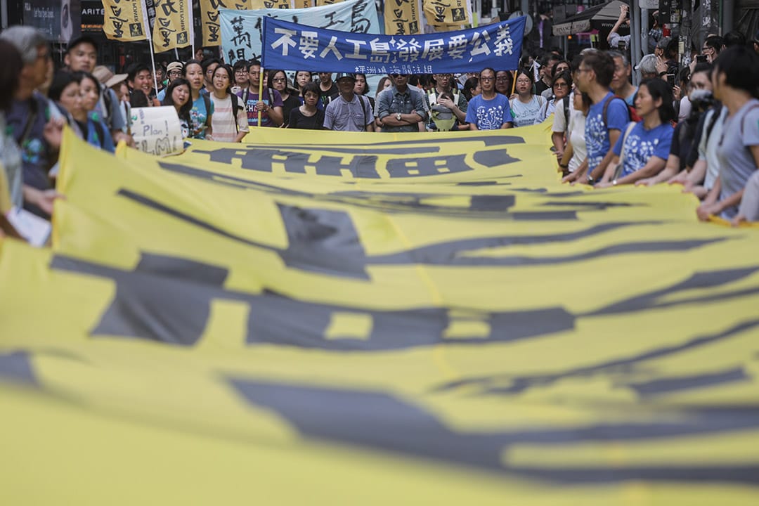 今日(10月14日)下午3时,团体“守护大屿联盟”发起“反对东大屿填海游行”,民众从铜锣湾东角道起步,游行至金钟政府总部。有市民举起“祸留后代”等标语,高呼“明日香港 我哋话事”。警方指游行最高峰时有5800人参与,立法会议员朱凯廸则估计上街人数约有1万人。