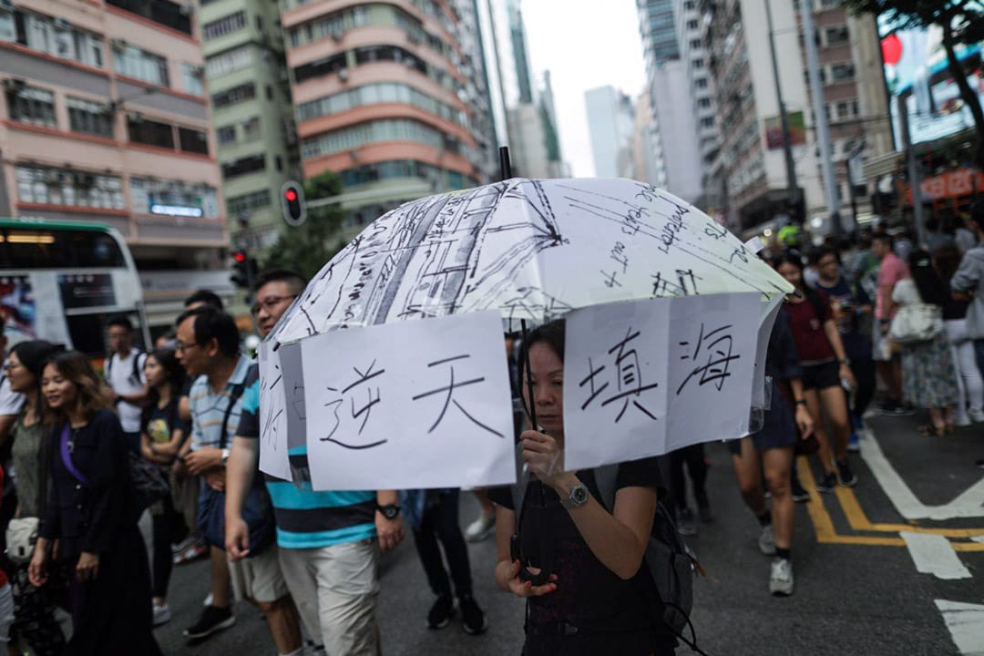 人聲鼎沸,繽紛的泡泡隨風飄向商業大樓。不到半腰高的孩子們,舉著各式各樣的紙牌,臉上畫著東大嶼山和海豚的圖案,和父母一齊整裝待發。一向是遊客和商業中心的銅鑼灣,被遊行的人潮劃出了一片「紅海」。
