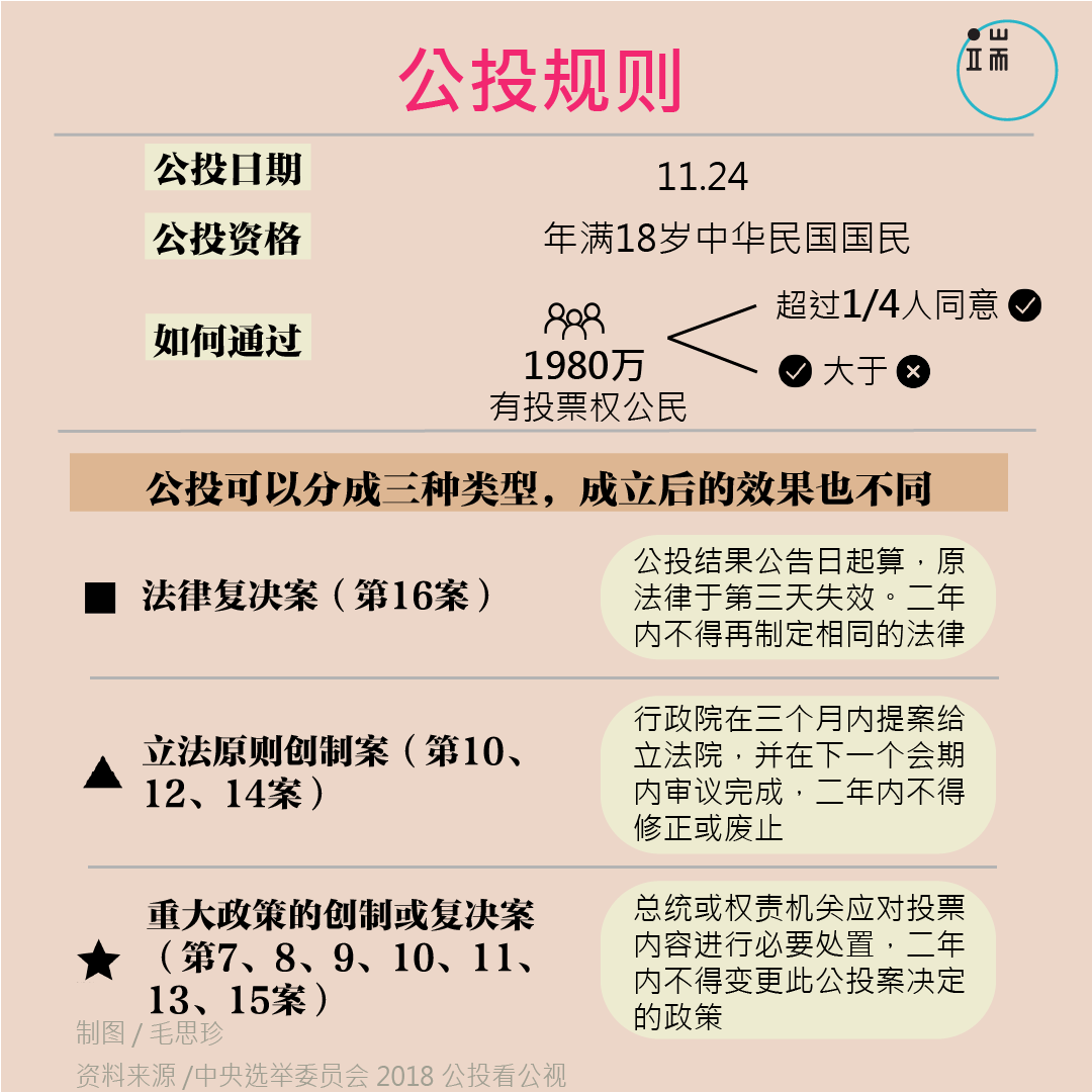 编按:2018大选数据专题由《端传媒》与台湾大学新闻研究所共同企划、制作。以简明、精致的图表,多面向解析2018台湾大选的特色及结果。本篇为第二篇,汇整公民投票所有重要信息。为什么要发动公民投票?公投怎么投?同性婚姻和性教育
