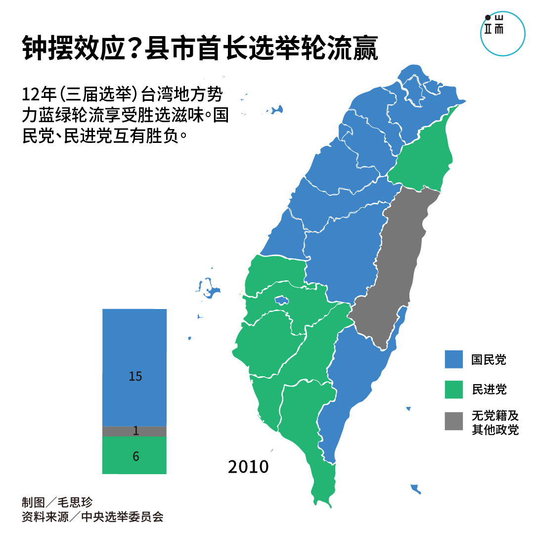 编按:2018大选数据专题由《端传媒》与台湾大学新闻研究所共同企划、制作。以简明、精致的图表,多面向解析2018台湾大选的特色及结果。本篇为系列四:得票总览分析。钟摆效应2010年县市首长选举中,国民党大胜,赢得15个县市首长。2014年,民进党反败为胜,夺回13个县市首长。2018年,国民党重温胜利,夺得15个地方首长。胜负变化有如钟摆。