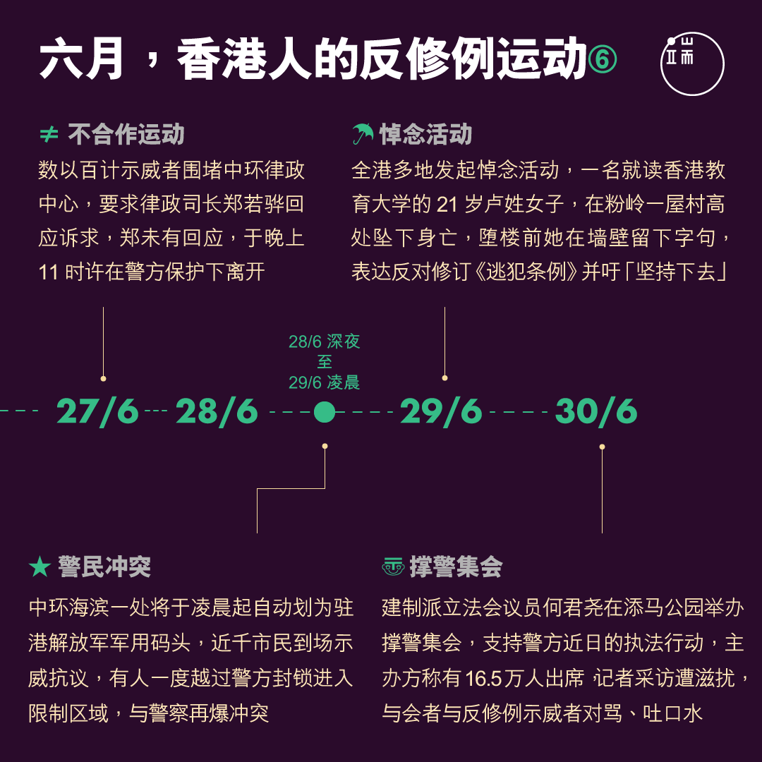 2019年7月1日,香港回归中国22周年。漫长而炎热多雨的六月刚刚过去,反对《逃犯条例》修订的香港人,日程划满了各式各样的抗争活动,从游行集会,到占领包围,前线的有不合作运动,后援的有文案宣传。人们一次又一次创造历史,一个月内两次逾百万人的游行,一星期内两次包围警察总部,一日内众筹达670万元,成为震惊全球的社会运动。你记得他们如何一路走来吗?