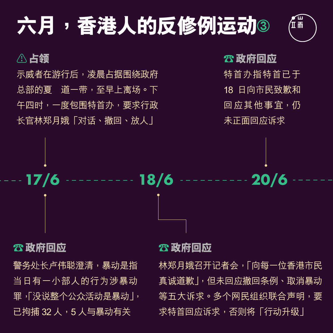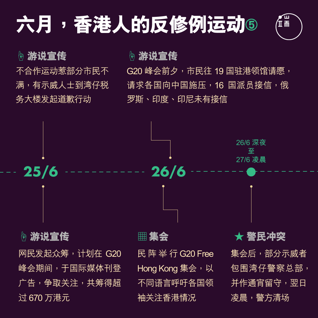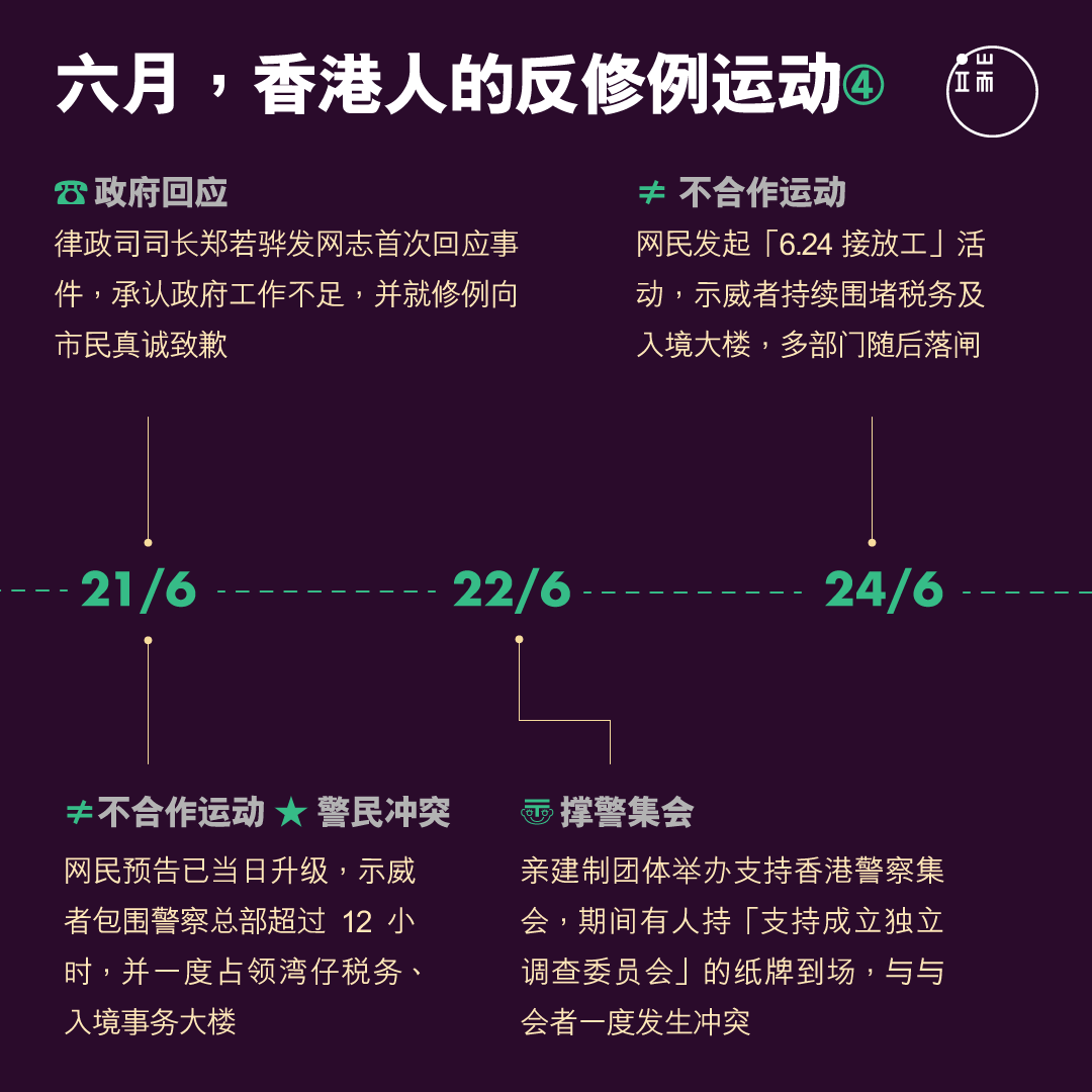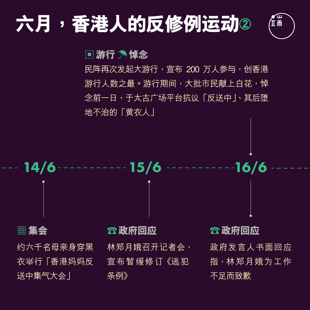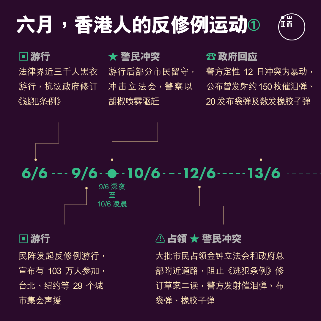 2019年7月1日,香港回归中国22周年。漫长而炎热多雨的六月刚刚过去,反对《逃犯条例》修订的香港人,日程划满了各式各样的抗争活动,从游行集会,到占领包围,前线的有不合作运动,后援的有文案宣传。人们一次又一次创造历史,一个月内两次逾百万人的游行,一星期内两次包围警察总部,一日内众筹达670万元,成为震惊全球的社会运动。你记得他们如何一路走来吗?