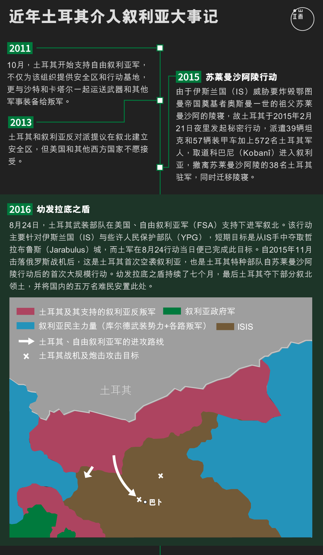 2019年9月24日,在联合国大会上,土耳其总统埃尔多安(Erdogan)宣布土军将“在国际社会支持下”进入叙利亚北部,并建立一条长480公里,宽30公里的“和平走廊”,以容纳土耳其现时接纳的数百万叙利亚难民,并借此打击被政府认为有分裂意图的“库尔德工人党-库尔德人民保卫部队(PKK-YPG)恐怖组织”。在两个多星期后的10月9日,土耳其军队开始越过土叙边境,向叙利亚北部进军。这场军事行动被土耳其官方称为“和平之泉”(Peace Spring)计划。这是2016年以来土耳其第三次在叙利亚境内展开军事行动。