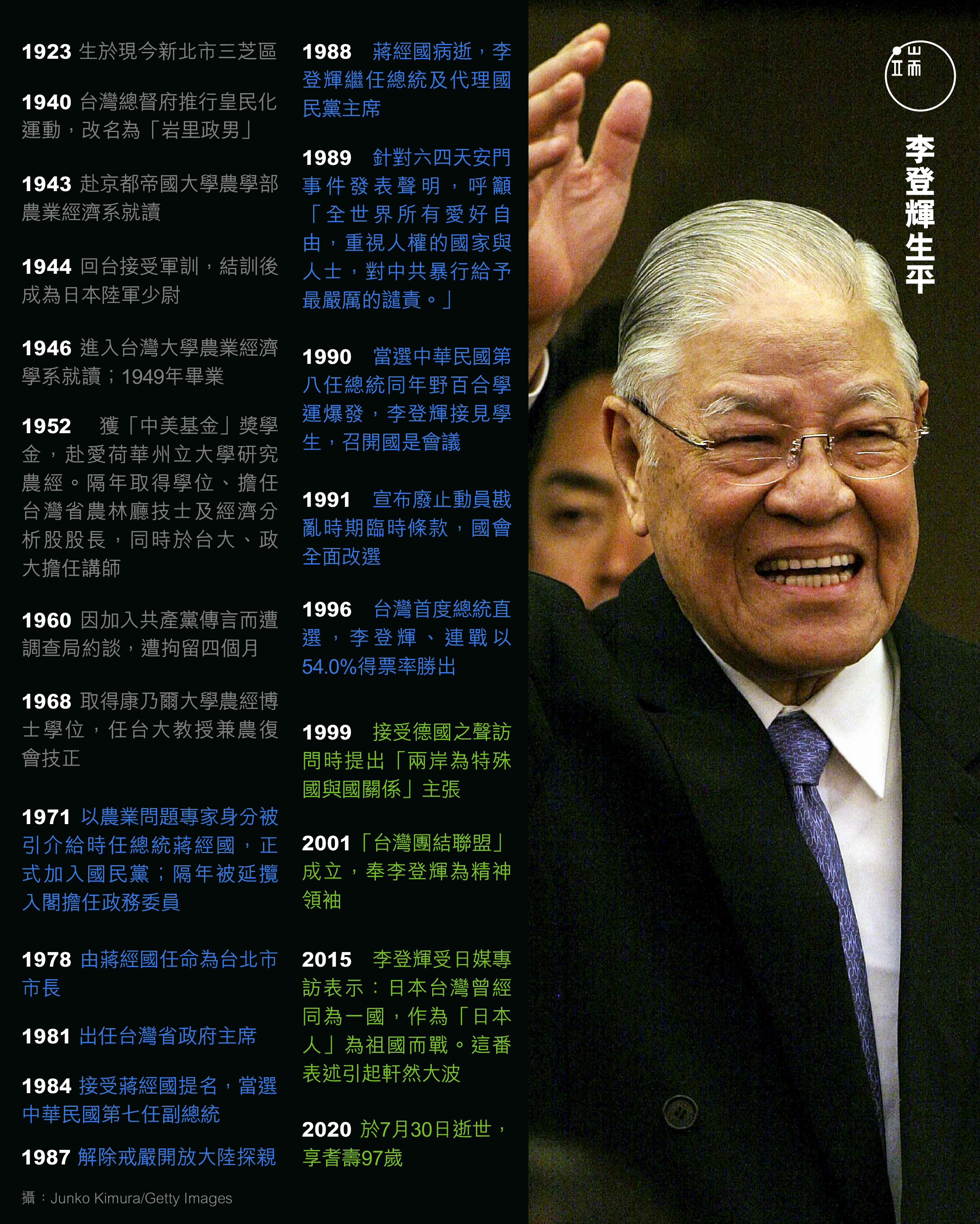2020年7月30日,台北榮民總醫院宣布李登輝逝世。歷史,重重地翻過了一頁。從日治時代走到中華民國;從皇民、皇軍、左翼學生到國民黨技術官僚,再從頒布「國家統一綱領」的中華民國總統到台獨教父。這麼多的面貌,哪一個才是「真正的」李登輝?而李登輝這些多變的面貌,如何影響台灣的歷史,使台灣呈現現在的面貌?你們可以瞭解我做了差不多一年的共產黨員,很早就離開新民主同志會。我負責過學生活動,以後感到沒什麼意思,就離開共產黨。李登輝(《李登輝總統訪談錄》)李登輝(《李登輝總統訪談錄》)