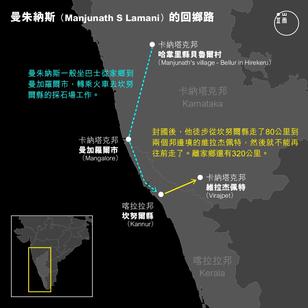 3月28日星期六,印度南部阿拉伯海濱的喀拉拉邦坎努爾縣(Kannur),某處採石場安靜得一反常態。這裏已經停工四天了。工人曼朱納斯(Manjunath S Lamani)決定,和一行卡納塔克邦北部的老鄉一起徒步回家。傍晚七點,他們出發了。