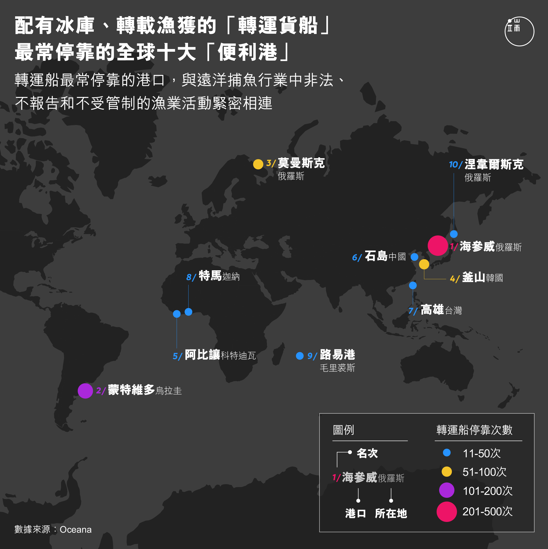 報告還列出了曾在海上與漁船接觸過的轉運船最常經停的港口。對於非法漁獲缺乏監管的港口,被稱作「便利港」(convenience ports),轉運船更願意來這樣的港口卸貨。在 Oceana 報告中列出的全球便利港中,在蒙特維多(Montevideo)港經停的轉運船,排名第二。