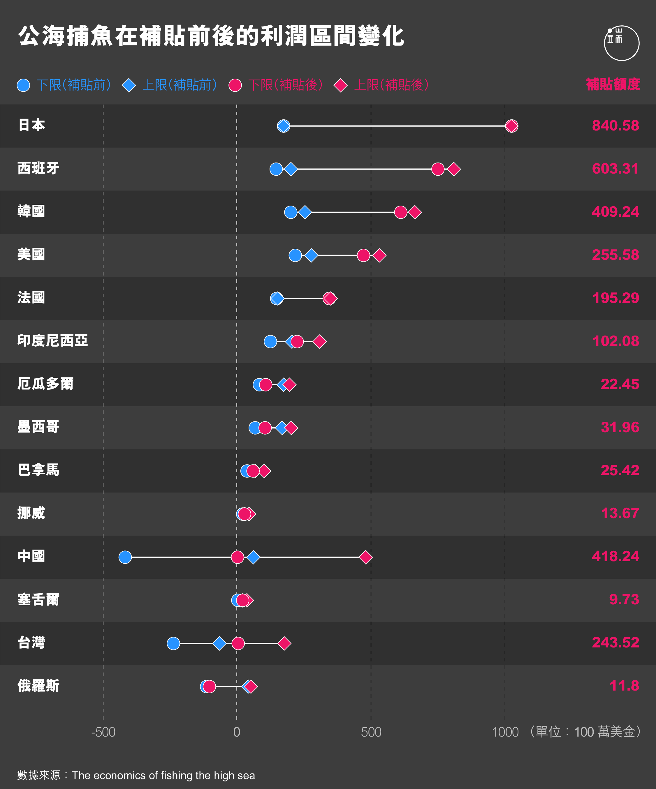 換句話說,若非有燃油補貼,遠洋漁業便不盈利。這一點,並不只適用於中國,事實上,據2018年發表在《Science Advances》上的一項研究,包括日本、西班牙、中國、韓國和美國等在內的遠洋漁業大國,在2016年,總共42億美元的政府補貼,人為地支撐了公海捕魚活動:這要比若不考慮補貼、最樂觀的經濟利潤估計值的兩倍還多。