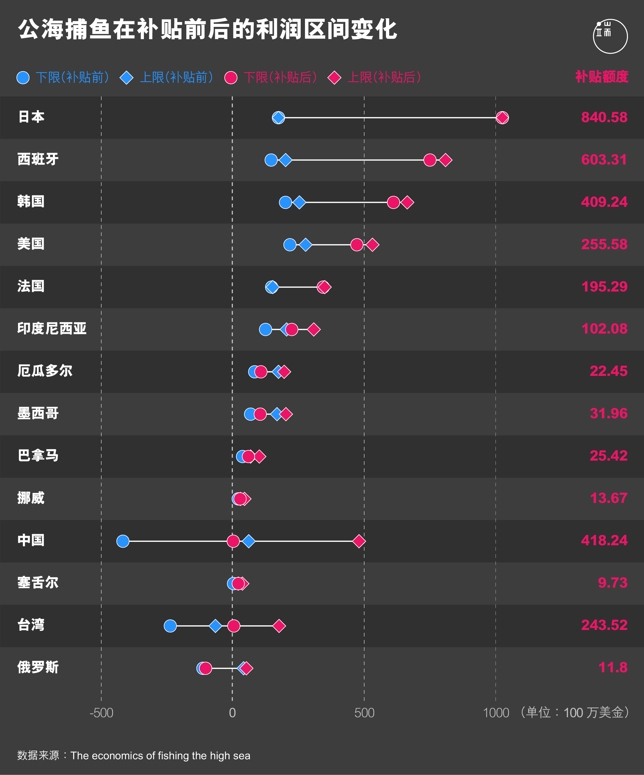 换句话说,若非有燃油补贴,远洋渔业便不盈利。这一点,并不只适用于中国,事实上,据2018年发表在《Science Advances》上的一项研究,包括日本、西班牙、中国、韩国和美国等在内的远洋渔业大国,在2016年,总共42亿美元的政府补贴,人为地支撑了公海捕鱼活动:这要比若不考虑补贴、最乐观的经济利润估计值的两倍还多。