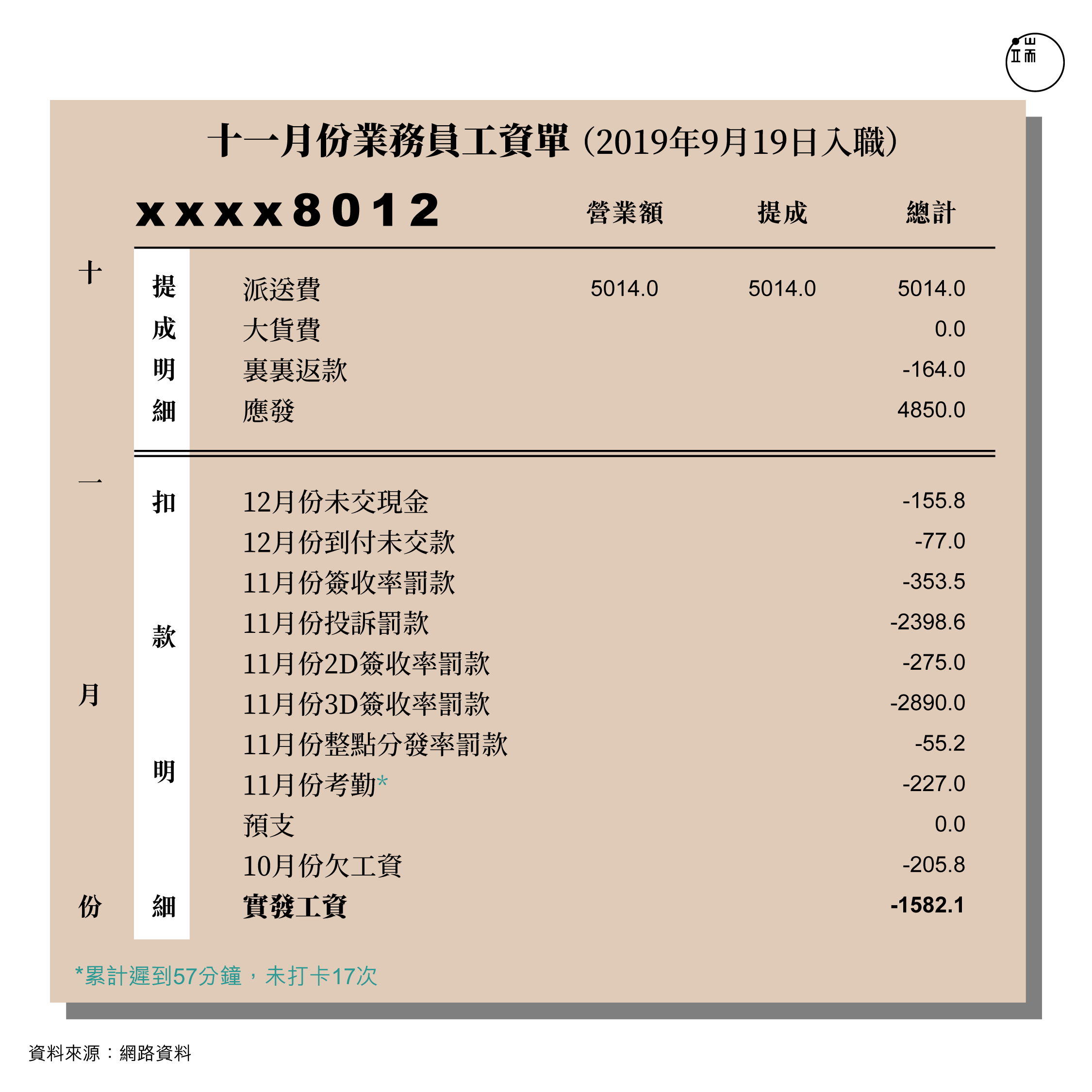 這是一張網上的資料——一個快遞員11月份的工資單,最後計算下來,公司還要倒扣他1582塊錢,這還是挺嚴重的。