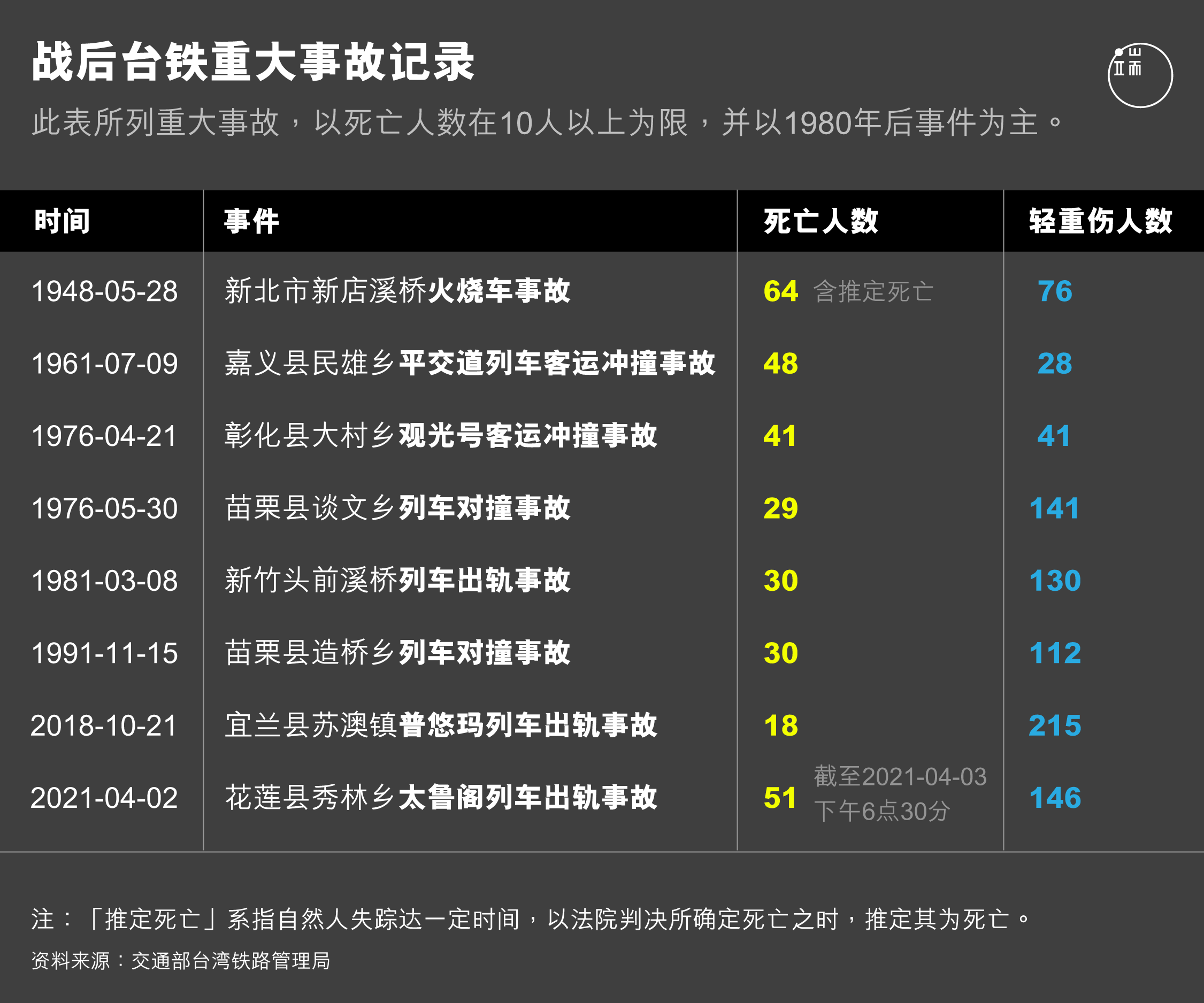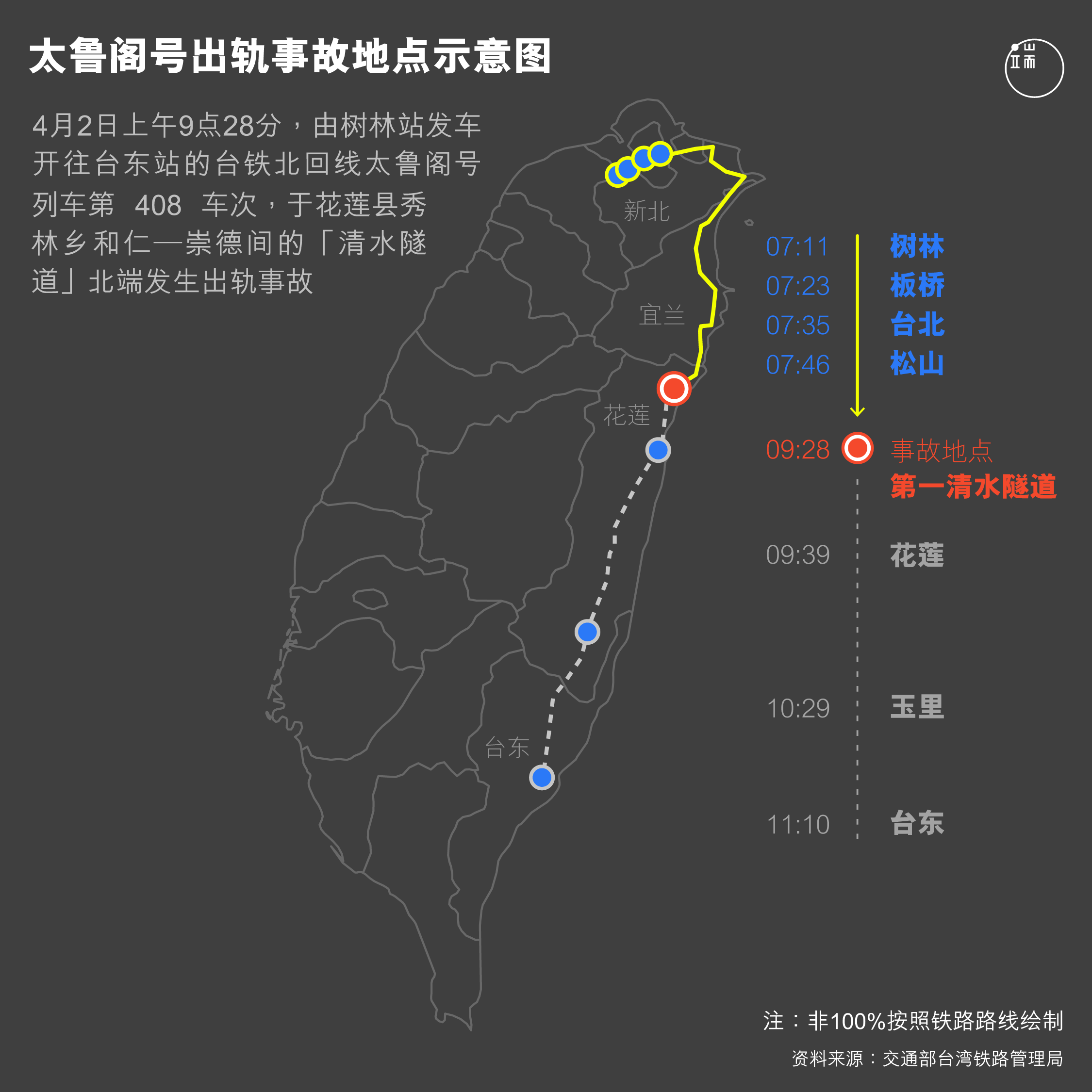4 月 2 日上午 9 点 28 分,由树林站发车开往台东站、载有 492 名旅客及 4 名乘务人员的台湾铁路管理局(下简称台铁)北回线太鲁阁号列车第 408 车次,于花莲县秀林乡和仁—崇德间的“清水隧道”北端发生出轨事故,导致51人死亡(编按:此为3日晚间官方统计结果,因部分遗体受损情形严重,死亡人数将依现场鉴识结果变动,罹难人数不排除再上修或下修)、超过百人轻重伤。