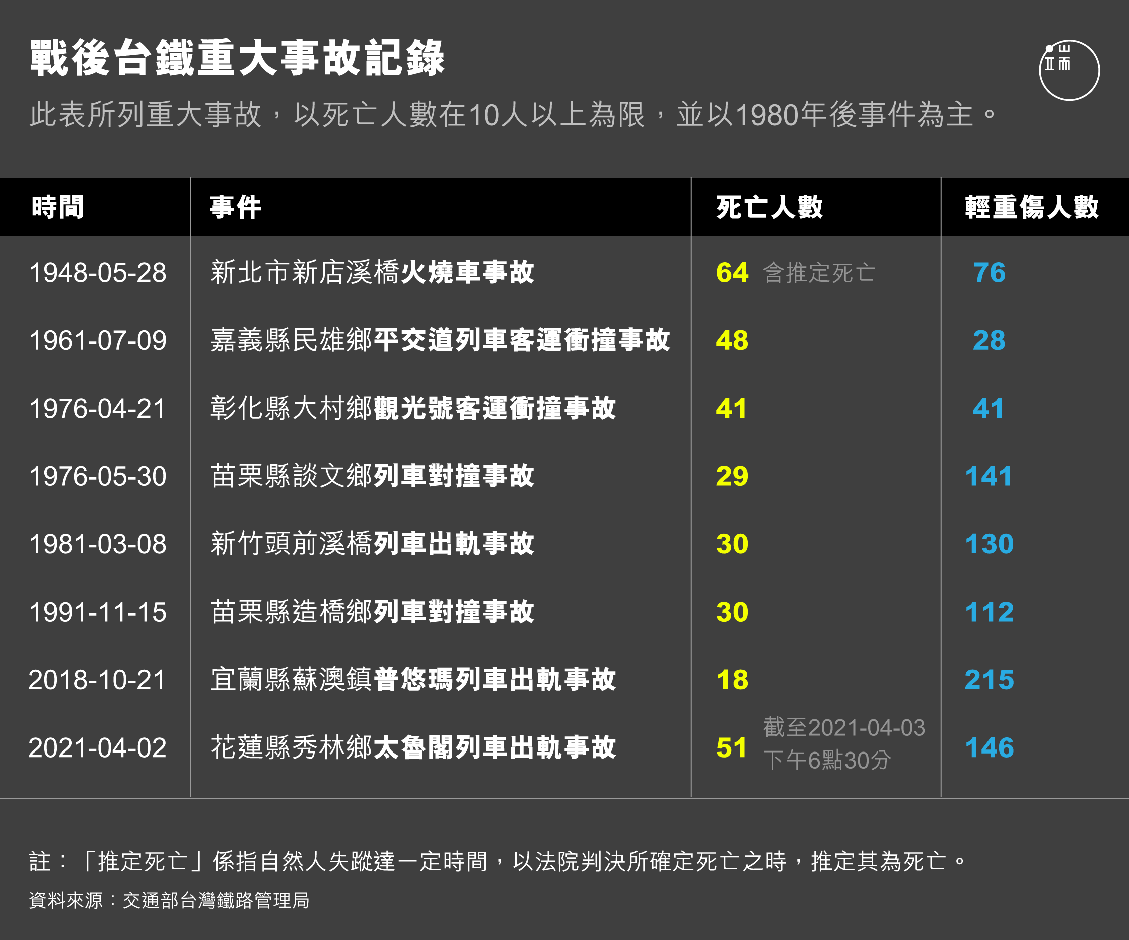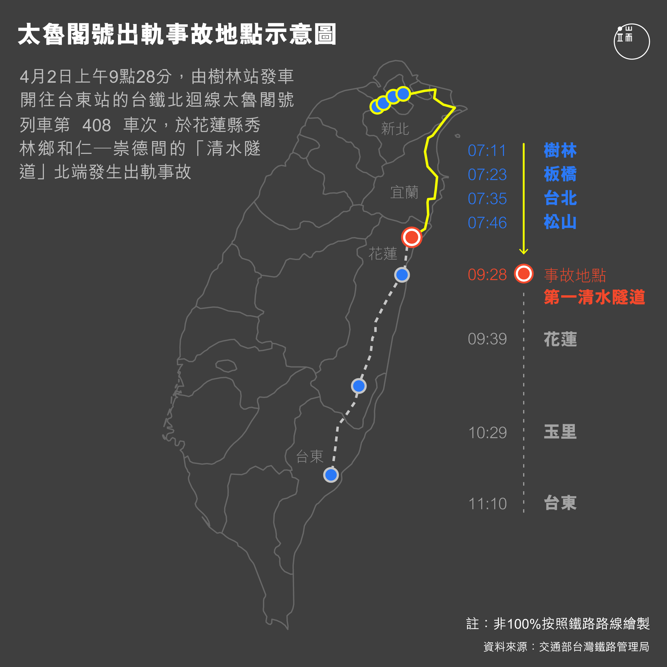 4 月 2 日上午 9 點 28 分,由樹林站發車開往台東站、載有 492 名旅客及 4 名乘務人員的台灣鐵路管理局(下簡稱台鐵)北迴線太魯閣號列車第 408 車次,於花蓮縣秀林鄉和仁—崇德間的「清水隧道」北端發生出軌事故,導致 51人死亡(編按:此為3日晚間官方統計結果,因部分遺體受損情形嚴重,死亡人數將依現場鑑識結果變動,罹難人數不排除再上修或下修)、超過百人輕重傷。