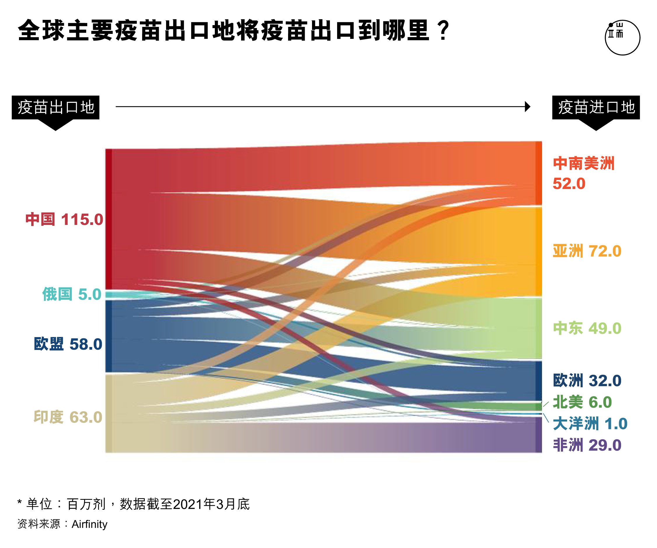 由于欧美国家COVID-19疫苗价格偏高,且自顾不暇,自2021年年初,东南亚、南美、中东以及东欧等不少发展中国家等不及COVAX(COVID-19 Vaccines Global Access,即2019冠状病毒病疫苗实施计划)的配给运输,选择向中国、印度及俄罗斯等国家订购疫苗。英国医疗分析公司Airfinity的数据显示,截至3月底,中国已出口疫苗高达1.15亿剂,为全球之最。印度次之,出口了6300万剂,欧盟则主要向英国、日本等国输送了5800万剂。