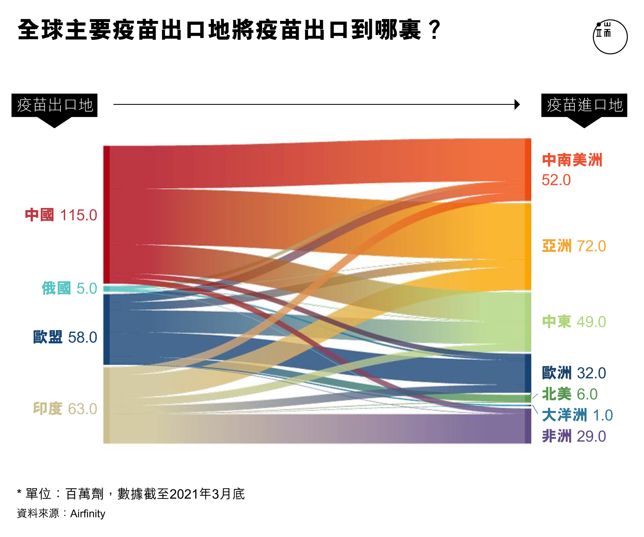 由於歐美國家COVID-19疫苗價格偏高,且自顧不暇,自2021年年初,東南亞、南美、中東以及東歐等不少發展中國家等不及COVAX(COVID-19 Vaccines Global Access,即2019冠狀病毒疫苗實施計畫)的配給運輸,選擇向中國、印度及俄羅斯等國家訂購疫苗。英國醫療分析公司Airfinity的數據顯示,截至3月底,中國已出口疫苗高達1.15億劑,為全球之最。印度次之,出口了6300萬劑,歐盟則主要向英國、日本等國輸送了5800萬劑。