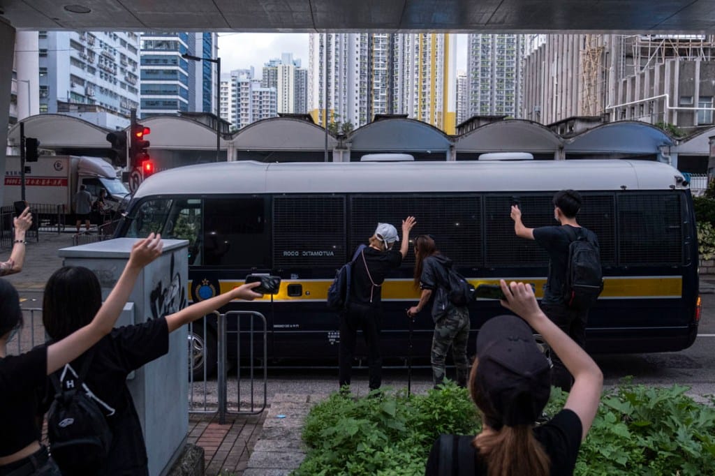 在截查行动中,最终有部分市民被带上警车,包括一名高举五一手势的黑衣女士,以及过去两年多次在反修例运动示威现场出现的王凤瑶“王婆婆”。