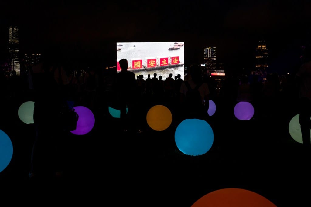 金钟添马公园内,香港各界庆典委员会举办“光影3D耀维港”表演,摆设灯饰及播放立体灯光片段,约有60人在表演开始前已带同国旗排队轮候。“贺建党百年、庆香港回归”,这两个过往少有并称的口号,在国歌声中奏合。今年是香港主权移交24周年,恰逢中共建党百年之日,在港区国安法生效后的香港,建制力量开始愈加强调中共在香港的角色和地位,身兼全国政协常委、香港各界庆典委员会主席的谭锦球早前在报章撰文指,“香港需要向港人、向海外讲好中国共产党不断发展‘一国两制’、佑护香港繁荣稳定的故事。”