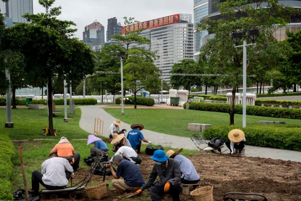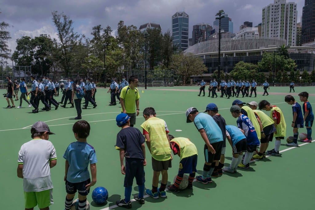 地处铜锣湾的维园,多年来都是七一游行的起点,大量团体和市民通常于七一下午三点集合,倘若人数太多逼爆维园,不少市民也会选择在外面主干道加入游行队伍。今日,多名手持橙色封锁带的警员在早上进驻维园,一字排开,组成人链驱赶在场市民。早前六四事件周年,警方同样引用公安条例,用橙带封锁维园。