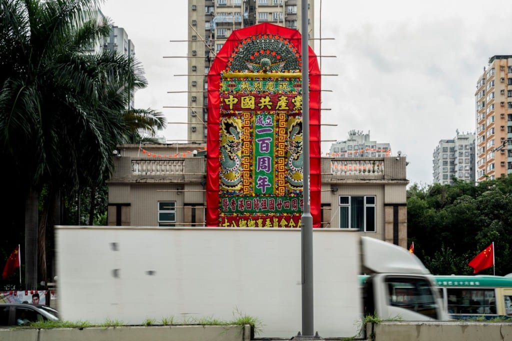 维港两岸的大厦,例如旧中银大厦,以及红磡隧道外的大型广告,均写有“贺建党百年”的字句。尖沙咀中心一带悬挂半空的国旗旗海、元朗乡村村屋竖立的巨型花牌;还有大大小小的庆祝回归活动、合唱、论坛、抽奖等,例如民建联举办的“会庆大抽奖”,都将回归和党庆一同并称。