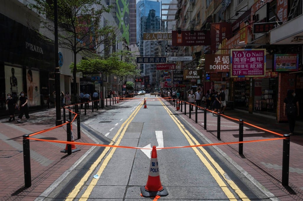 在国安法和疫情之下,橙带成为过去一两年香港警方常用的工具,在街头不同地方可随意划出封锁区,喝令记者和市民不得进入。今日,警方同样以橙带围封铜锣湾崇光百货附近的行人专用区记利佐治街,不时截查途经市民。