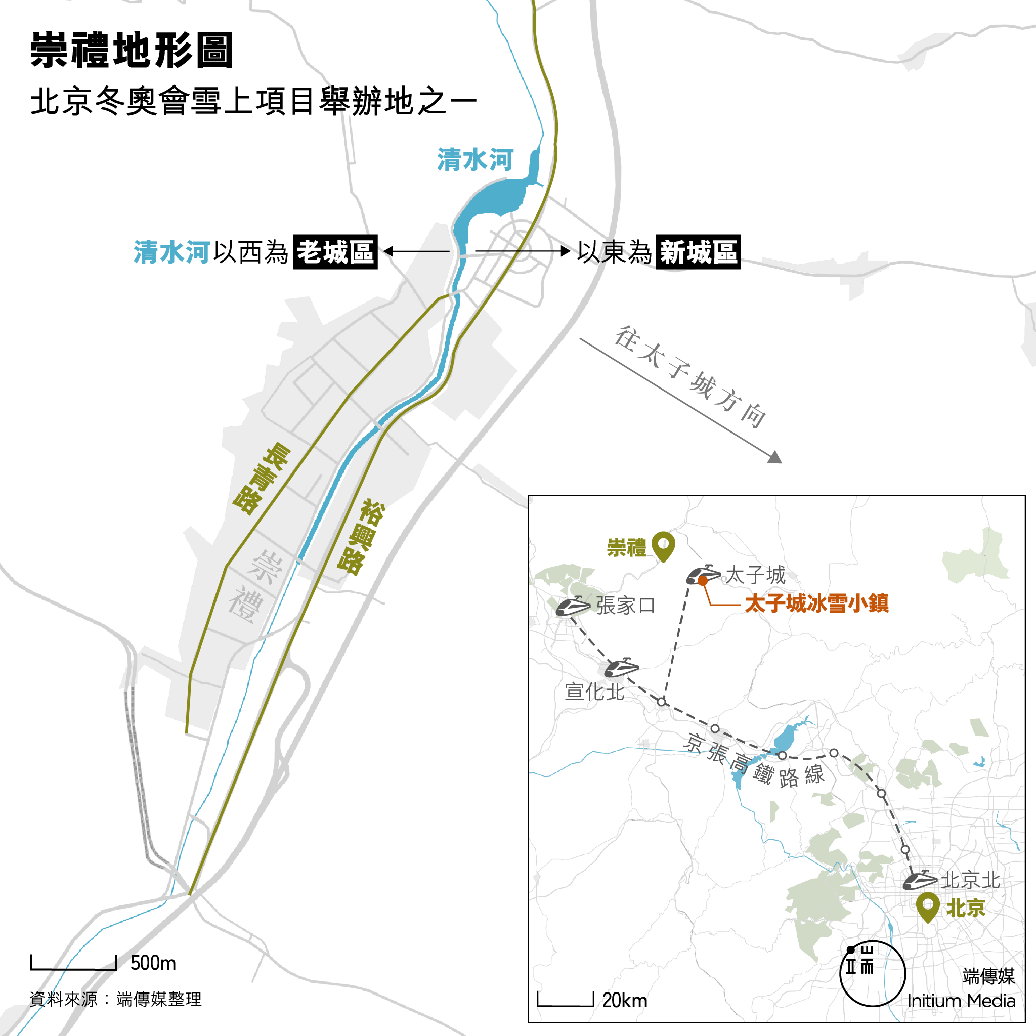 按照規劃,冬奧會大部分雪上項目將在河北省張家口市下轄的崇禮舉辦。一條新建的高鐵及一條高速公路由北京直達崇禮,還有一條高鐵從崇禮連接內蒙古錫林浩特。這座常住人口10萬的小城,將擁有兩座高鐵站,「成為連接內蒙古和北京的重要交通樞紐」。崇禮還將建起冬奧小鎮、媒體中心以及若干比賽場地,「打造國際知名的冰雪運動和冰雪旅遊勝地」。