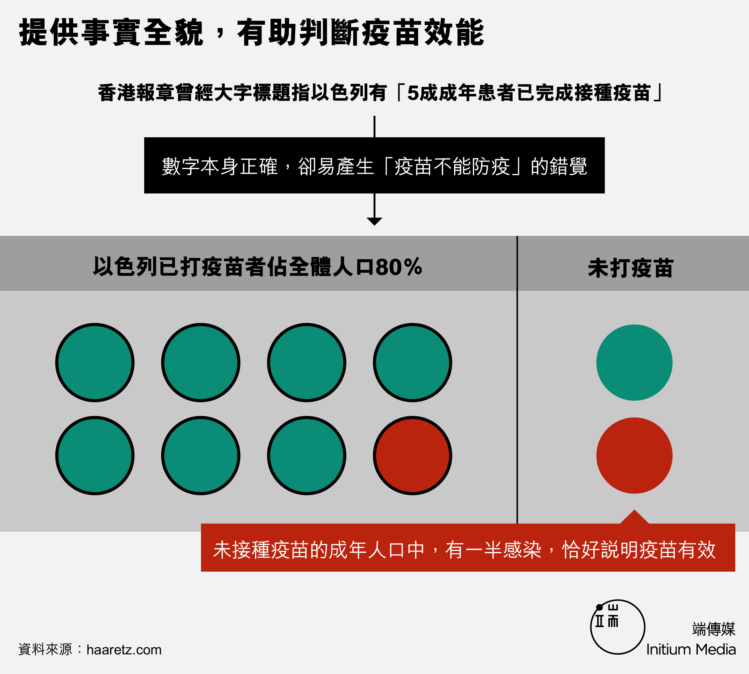 類似的情況,在整場疫情當中不停出現。例如有香港報章曾經大字標題指以色列有「5成成年患者已完成接種疫苗」,雖然這個數字本身正確,但標題卻無助讀者理解當時以色列的疫情,甚至容易產生誤解,讀者一不留神,同樣很容易產生「疫苗不能防疫」的錯覺。