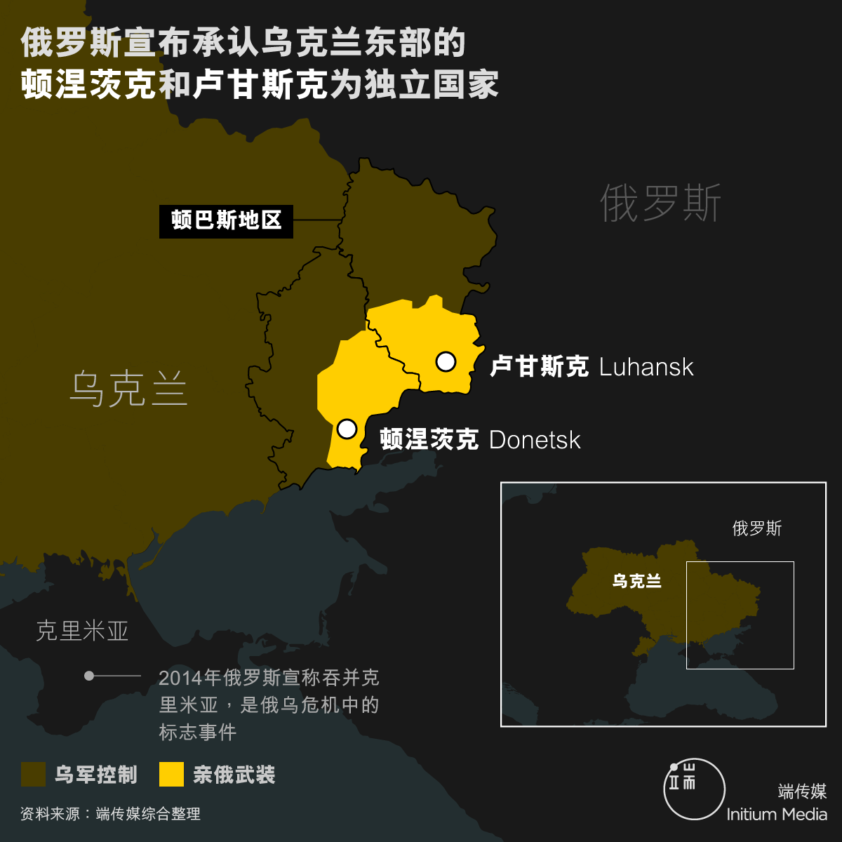 当地时间2月21日晚,俄罗斯官方放送了总统普京的一次长篇电视讲话。坐在办公桌前,普京滔滔不绝地,以虐待同声传译的方式讲了将近一个小时。通篇讲话几乎都在抨击和讽刺乌克兰政府。在结尾,他宣布俄罗斯将承认乌克兰东部两个亲俄武装控制的自治地区——顿涅茨克人民共和国(DPR)和卢甘斯克人民共和国(LPR)的独立地位。随后,俄罗斯官方宣布:将派遣部队进入这两个地区“执行维和任务”。