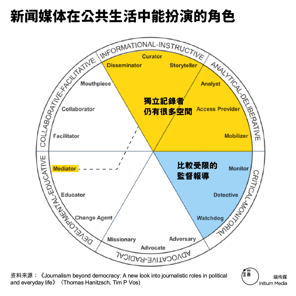 这两张图同时来自一篇论文,它里面探讨的是新闻媒体在公共生活和个人的日常生活中到底有什么样的意义。第一张图展现的是新闻媒体在公共生活中能扮演的角色。右下角这个monitor、detective、watchdog,这其实是比较偏向于刚才大家说到、现在比较受限的监督报导。但如果看其他方面的话,做独立记录者是有很多的空间的。图中我们看到analyst(分析者),或者叫access provider,即提供一个平台,让大家可以通过它来发声。比如微博大V或者一些有影响力的人,会开放自己的私信来传递大家的声音;再比如说MeToo参与者弦子,她微博还在的时候会转发很多受性侵的当事人的消息。我们目前已经能看到很多这样的记录者,当他积累一定粉丝之后,实际上就成了一个access provider。还有上面的curator、disseminator、storyteller(讲故事的人、把信息聚拢起来去传播的人)也在做information curation这方面的一些事情。他们会去收集、发布一些信息,比如说NGOCN每天都会发布一个日报,其实就是扮演了这样一个角色。左下角有一个mediator(调停者),它的作用是去促进对立的群体沟通,这其实是传统媒体做得比较少、比较差的,但我不知道作为一个记录者,能不能通过这种个人化的记录成为一个媒介,在相互不理解的群体之间去促进相互理解。