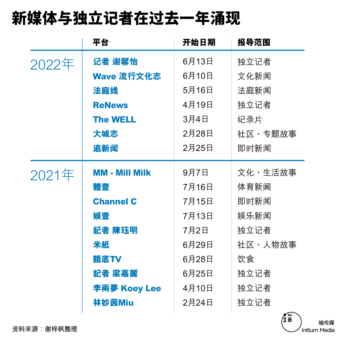 针对新的媒体和平台,我自己做了一个简单的整理。很多苹果本来的记者出来开了新的平台,涵盖了不同的方面,其中饿底TV是讲饮食的,由原苹果副刊《果籽》的记者们组建起来。最近出来比较重磅的是《法庭线》,它提供了一个平台,让法庭记者可以重新聚起来再做法庭的报导。从这些状况我们可以了解到,很多新闻工作者还是留了下来做事情。