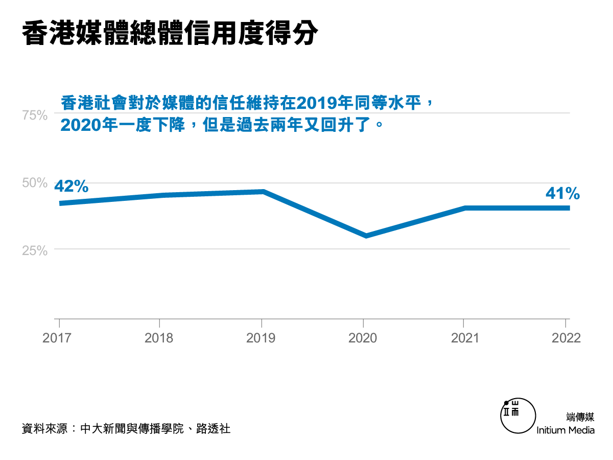 但是從數據來看,香港對新聞的readership還在。中大新傳每年都会跟路透社做一個新聞閱讀報告,其中有一個Trust Score,有趣的是現在香港社會對於媒體的信任其實依然維持在2019年同等水平,2020年的時候它掉下去了,但是過去兩年又回升了。這兩年我自己和身邊的朋友都沒有覺得有一個很明顯的「逃避新聞」的傾向。剛剛紀堯提到的一些獨立媒體和前輩新開創的新聞平台,作為一個newcomer to the industry,他們一開始受到的關注其實是挺不錯的。