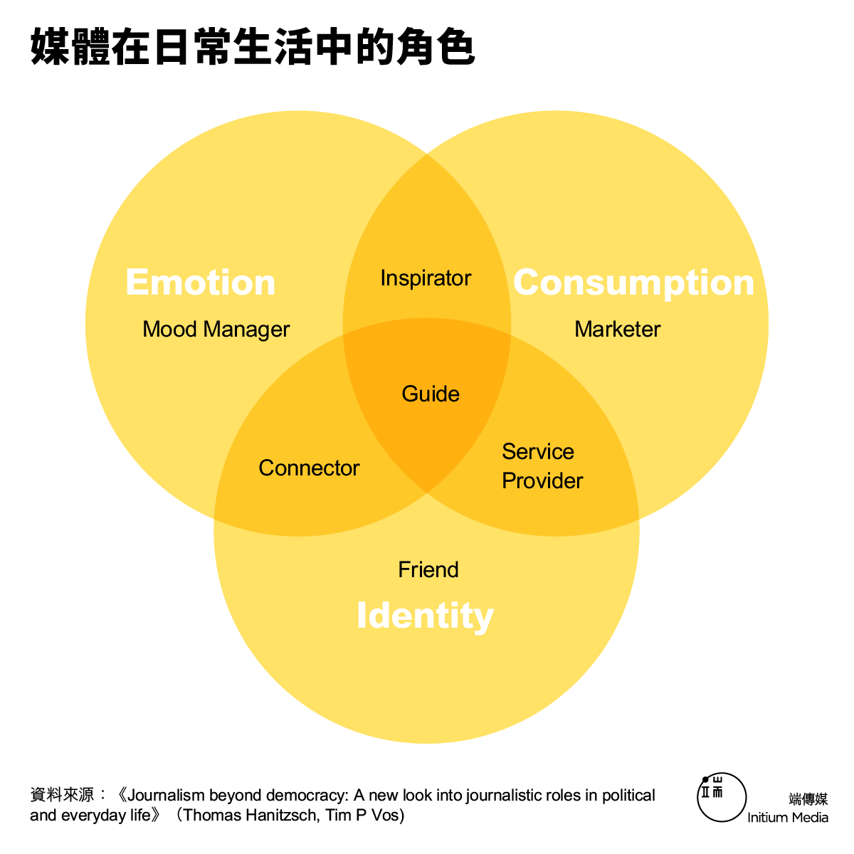 下一張圖展現的是媒體在日常生活中的角色,它有三個主要部分:emotion、consumption和identity(情緒、消費和身份認同);中間又分了各種各樣的角色,比如管理情緒的角色、嚮導的角色、提供服務的角色、當你的朋友的角色。傳統媒體受限於它的生產模式,其實是比較少扮演這些角色的;而當很多人參與獨立記錄之後,大家可以去思考,「我是不是在某種程度上可以去扮演這些角色?」