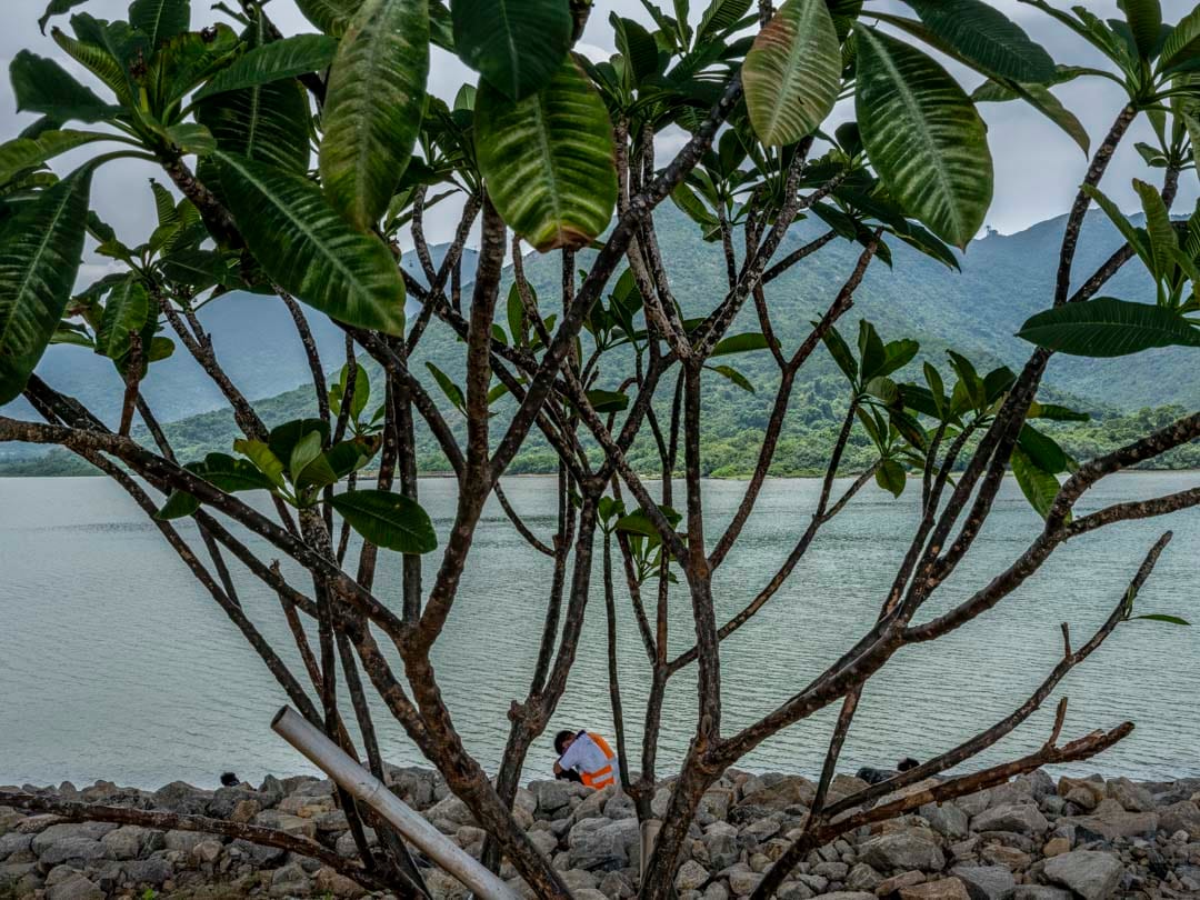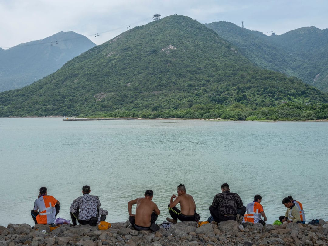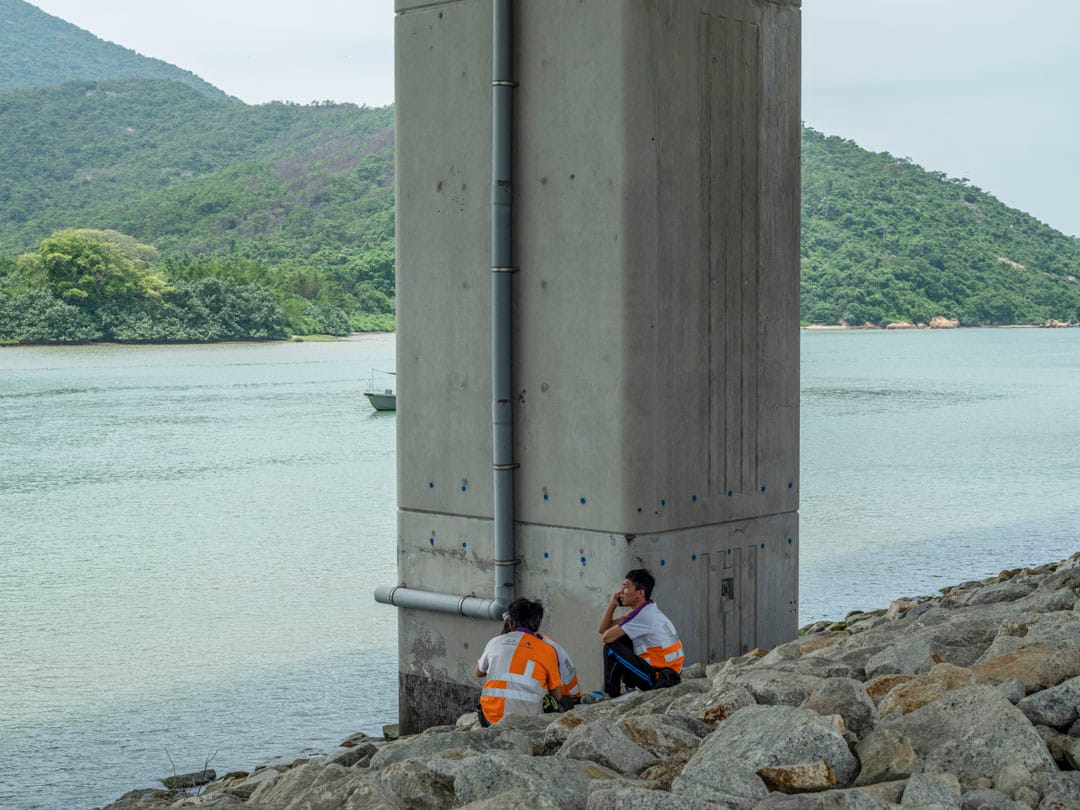 每逢中午12时,香港赤𫚭角海岸便会涌现一点点萤光色的人影。港珠澳大桥从这里起始,离开大屿山横跨海峡,穿过海洋,抵达珠海和澳门。车辆在上头全速前进,桥下,身穿反光衣的建筑工人各自占据一块舒适的阴影。他们在大屿山山峦对面吃饭、抽烟、谈天和看电话,甚至累得忘记脱下安全帽,席地而睡。
