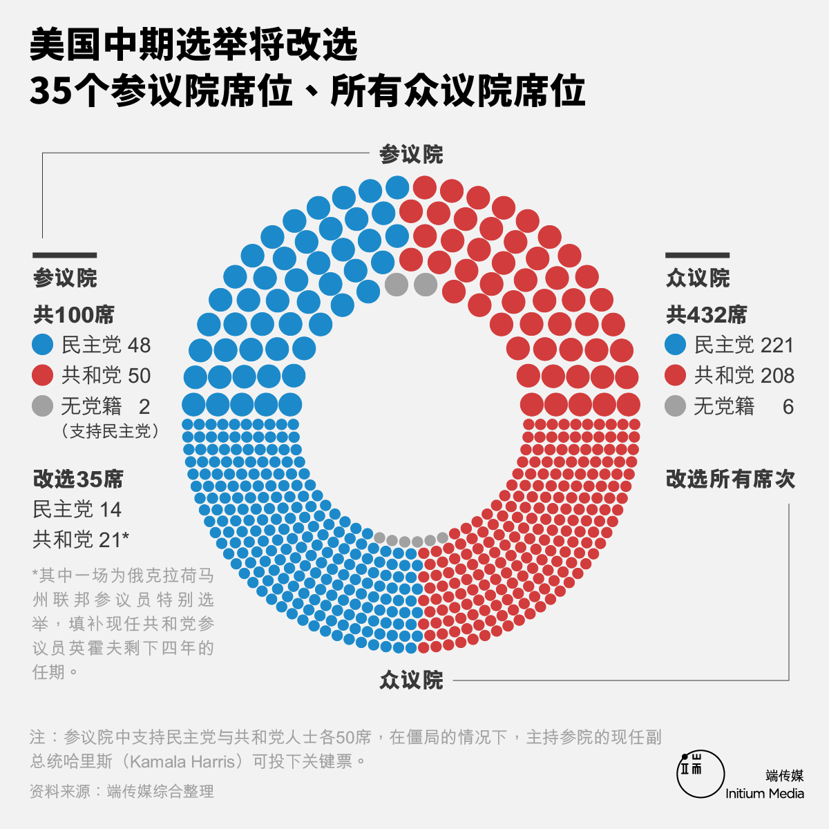【编者按】美国2022年度中期选举将于11月8日举行,届时将有35个参议员﹑435个众议员和36个州长席位面临改选。这是拜登上任以来最重大的一次考验,同时也将对美国下一阶段内政外交政策的走向产生重大影响。端传媒将在10月至11月初刊登“中期选举前瞻”系列,试图为读者整理两党在各州的具体选情﹑民调走向﹑亲台议员选情﹑以及堕胎﹑学债和经济等重大议题的影响。这篇为前瞻系列的第一篇,将会解释中期选举的重要性,以及两党在参﹑众两院的选举部署。