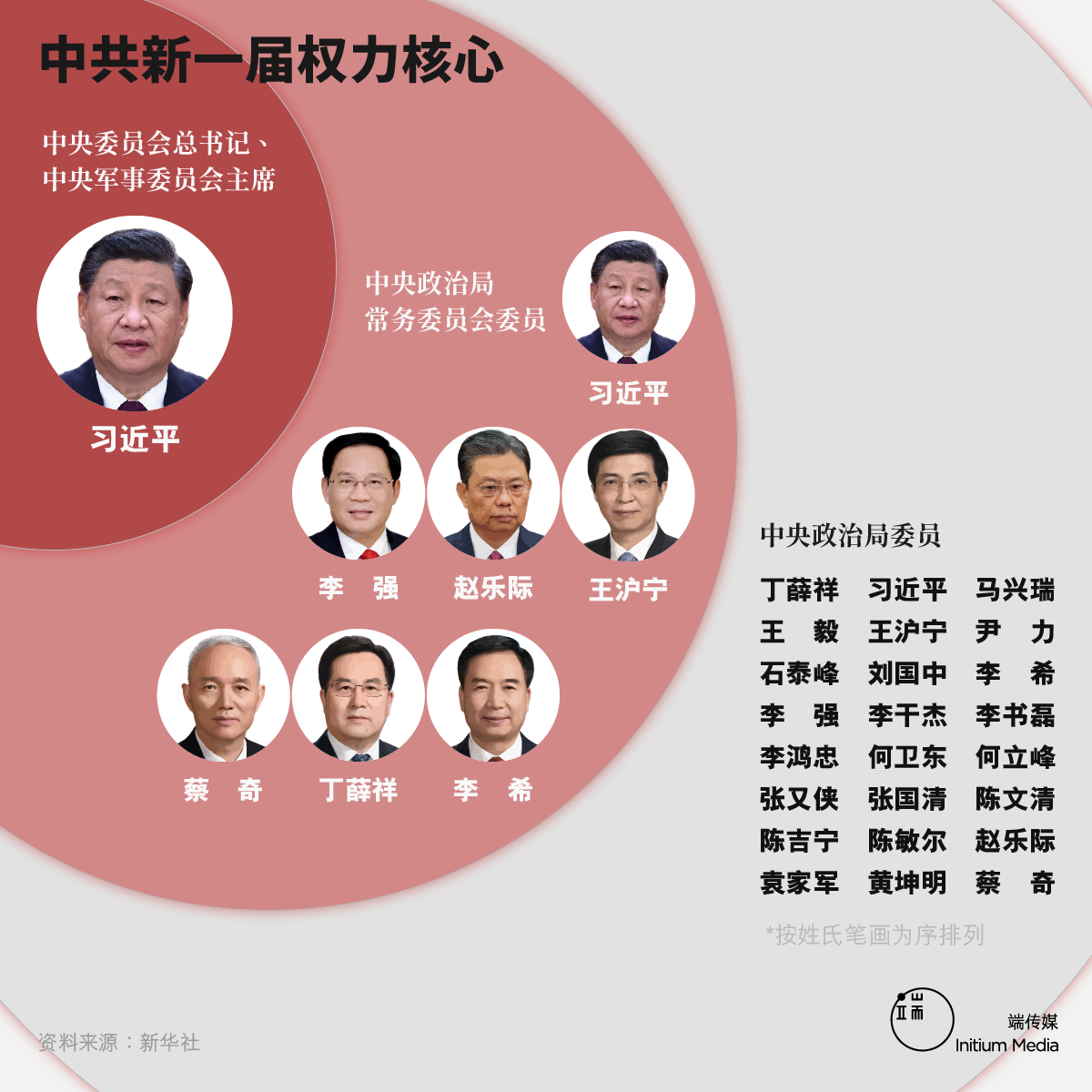 备受关注的中共政治局常委名单落地,依次为:习近平、李强、赵乐际、王沪宁、蔡奇、丁薛祥、李希。除习近平、赵乐际、王沪宁外,其他四人均为首次“入常”。