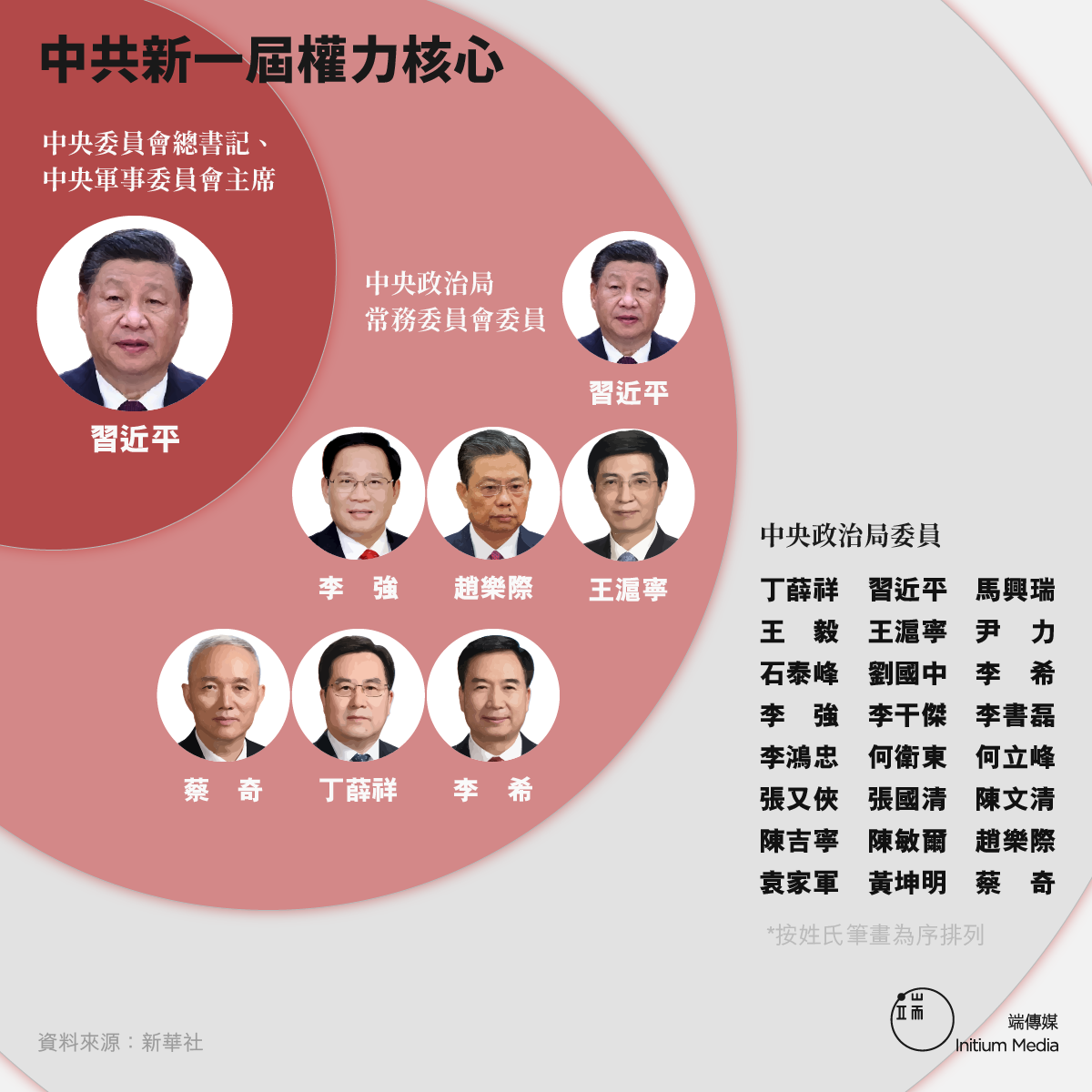 備受關注的中共政治局常委名單落地,依次爲:習近平、李強、趙樂際、王滬寧、蔡奇、丁薛祥、李希。除習近平、趙樂際、王滬寧外,其他四人均爲首次「入常」。