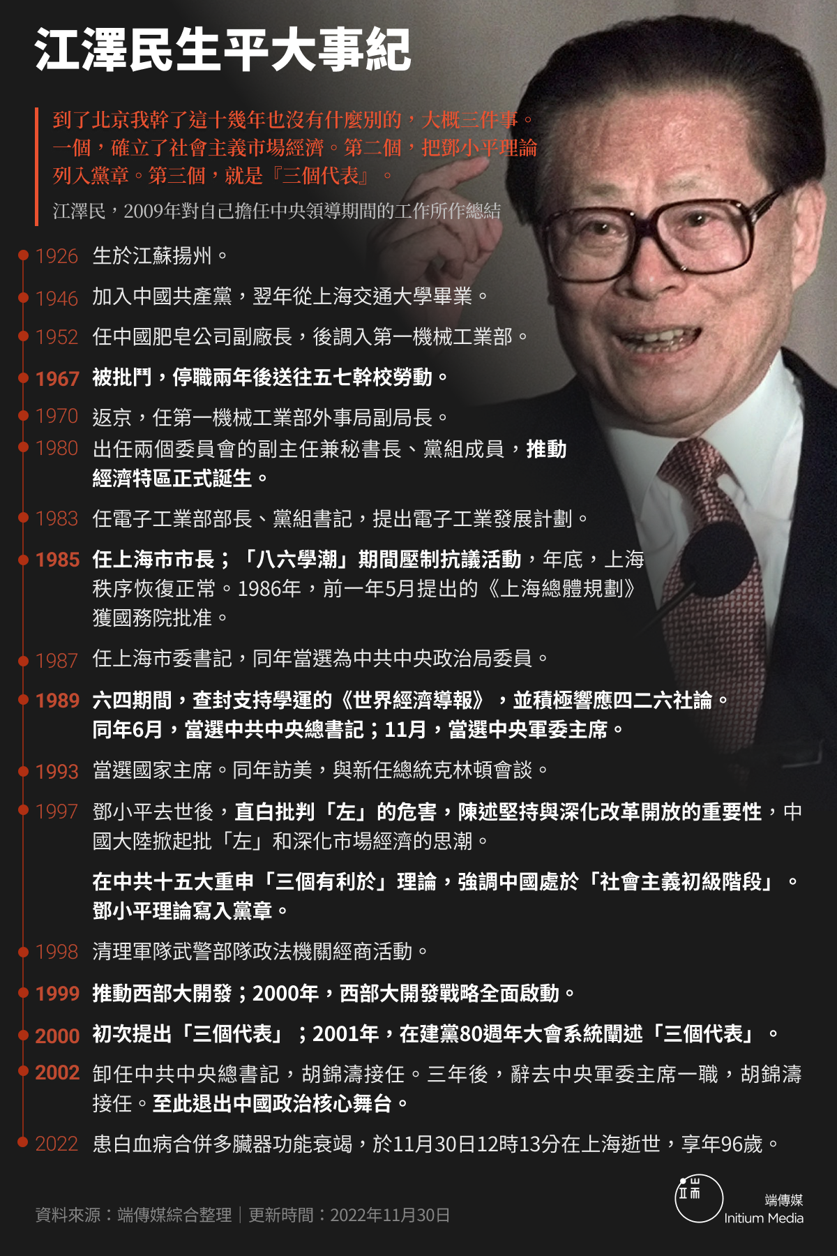 【編者按】新華社消息,前中共中央總書記、中國國家主席、中央軍委主席江澤民,因白血病合併多臟器功能衰竭,搶救無效,於2022年11月30日12時13分在上海逝世,享年96歲。