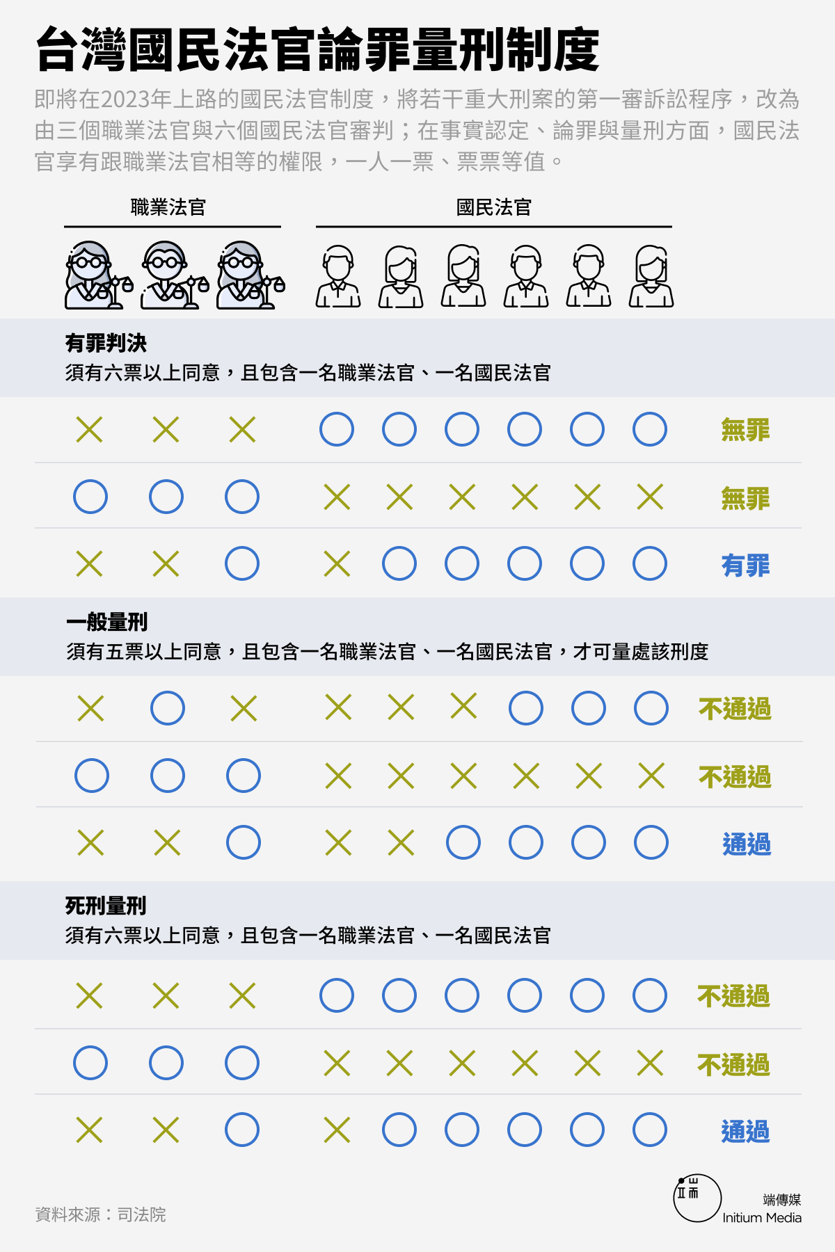 即將在2023年上路的國民法官制度,將若干重大刑案的第一審訴訟程序,從原本由三個職業法官審理,改為由三個職業法官與六個國民法官審判(國民法官法第3條第1項參照);在事實認定、論罪與量刑方面(也就是,在被告無罪或有罪、有罪則犯罪事實為何、構成什麼犯罪、該判多重),國民法官享有跟職業法官相等的權限,一人一票、票票等值(國民法官法第82條參照);有罪判決須以包含國民法官及職業法官雙方意見在內達三分之二以上之同意決定之(至少要六票有罪,而且六票當中至少包含一個職業法官、一個國民法官,才能判有罪),否則應為無罪判決(國民法官法第83條第1項參照)。