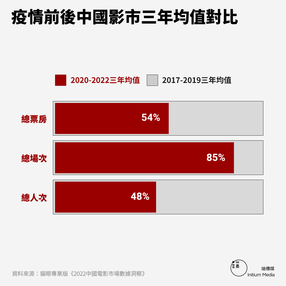2022年中國大陸電影市場年票房最終止步於接近300億人民幣的數字(儘管官方公佈的數字硬是湊上了300億的整),直接回到了2014年的水平,甚至如果不考慮網售平台的服務費的話,270餘億的票房水平離2014年的296億還差了不少。大陸電影市場此前的峰值是疫情前的2019年,年票房高達641億,當時沒珍惜現在回看已是天文數字。此番直接的腰斬也在市場的各個方面反映出來:貓眼研究院的電影市場數據報告顯示,對比2020-2022三年(疫情後)和2017-2019三年(疫情前)的均值,疫情後總體的影片放映場次數恢復到了疫情前的85%,但總人次的恢復進度則不足五成只到了48%,場均人次也從15.3人降到了8.6人,可以說整體產值和場均效益均在斷崖式下滑。而影院數雖然上升到了1.2萬家,但近三年的增速不斷放緩,考慮到不少倒閉關停影院還沒有直接反映到統計數據中,真實的情況只會更加艱難。